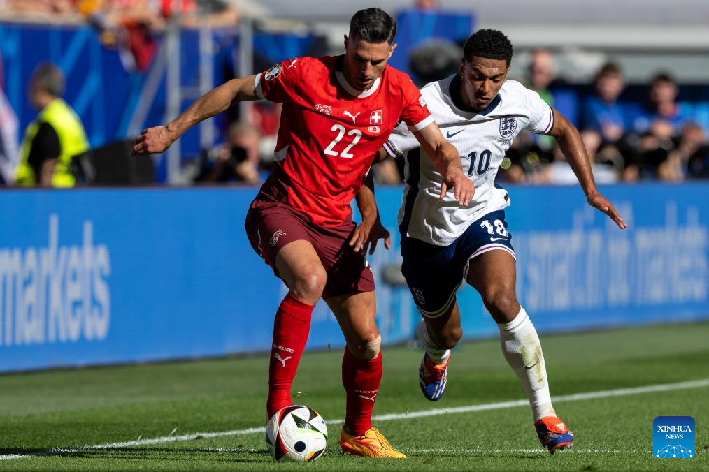 DUSSELDORF, 7 julio, 2024 (Xinhua) -- Imagen del 6 de julio de 2024 de Jude Bellingham (d), de Inglaterra, disputando el balón con Fabian Schar, de Suiza, durante el partido correspondiente a los cuartos de final de la EURO 2024 de la UEFA, entre Inglaterra y Suiza, en Dusseldorf, Alemania. (Xinhua/Xiao Yijiu)