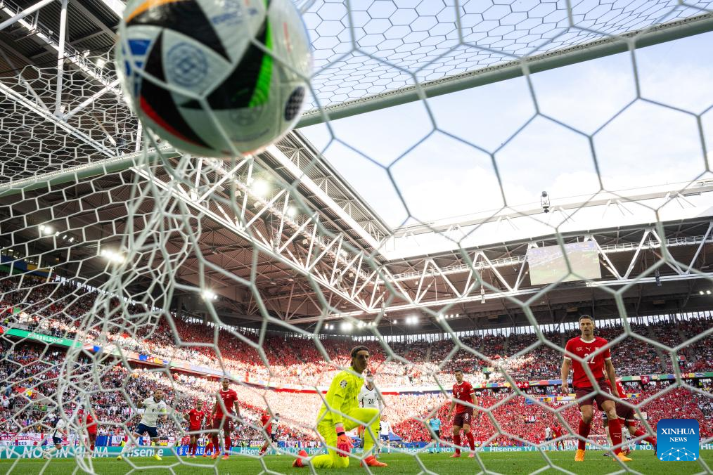 DUSSELDORF, 7 julio, 2024 (Xinhua) -- Imagen del 6 de julio de 2024 del guardameta Yann Sommer (c), de Suiza, observando el balón después de la anotación de Bukayo Saka, de Suiza, durante el partido correspondiente a los cuartos de final de la EURO 2024 de la UEFA, entre Inglaterra y Suiza, en Dusseldorf, Alemania. (Xinhua/Xiao Yijiu)