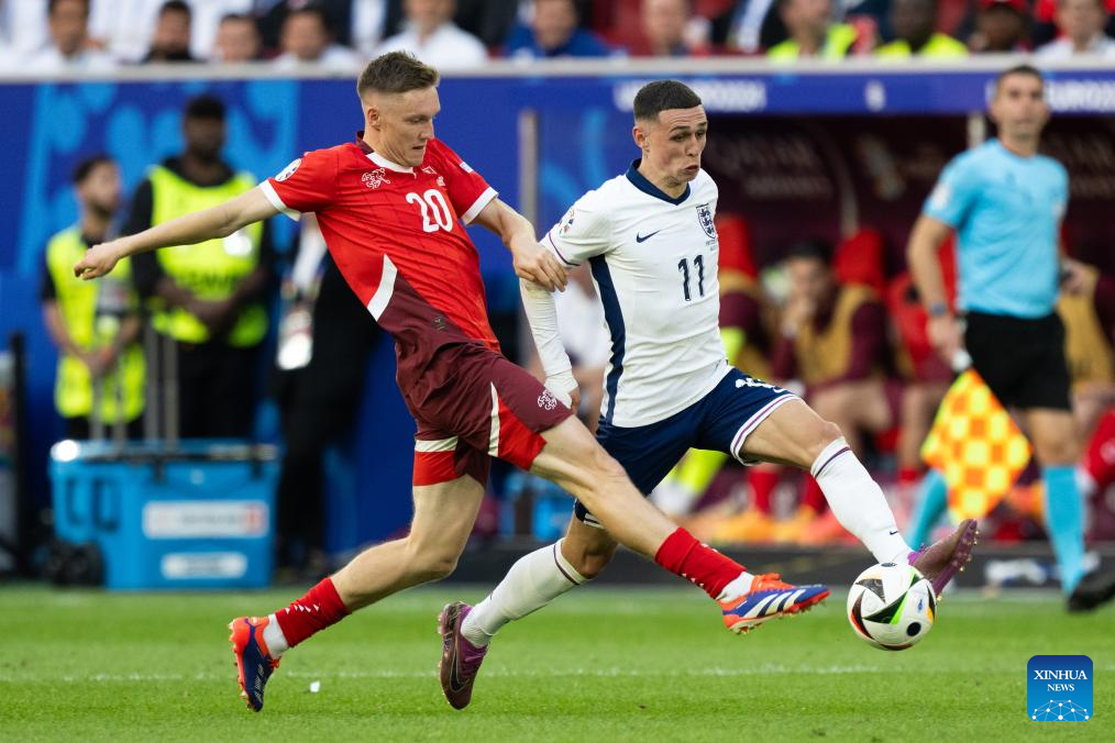 DUSSELDORF, 7 julio, 2024 (Xinhua) -- Imagen del 6 de julio de 2024 de Phil Foden (d), de Inglaterra, disputando el balón con Michel Aebischer, de Suiza, durante el partido correspondiente a los cuartos de final de la EURO 2024 de la UEFA, entre Inglaterra y Suiza, en Dusseldorf, Alemania. (Xinhua/Xiao Yijiu)
