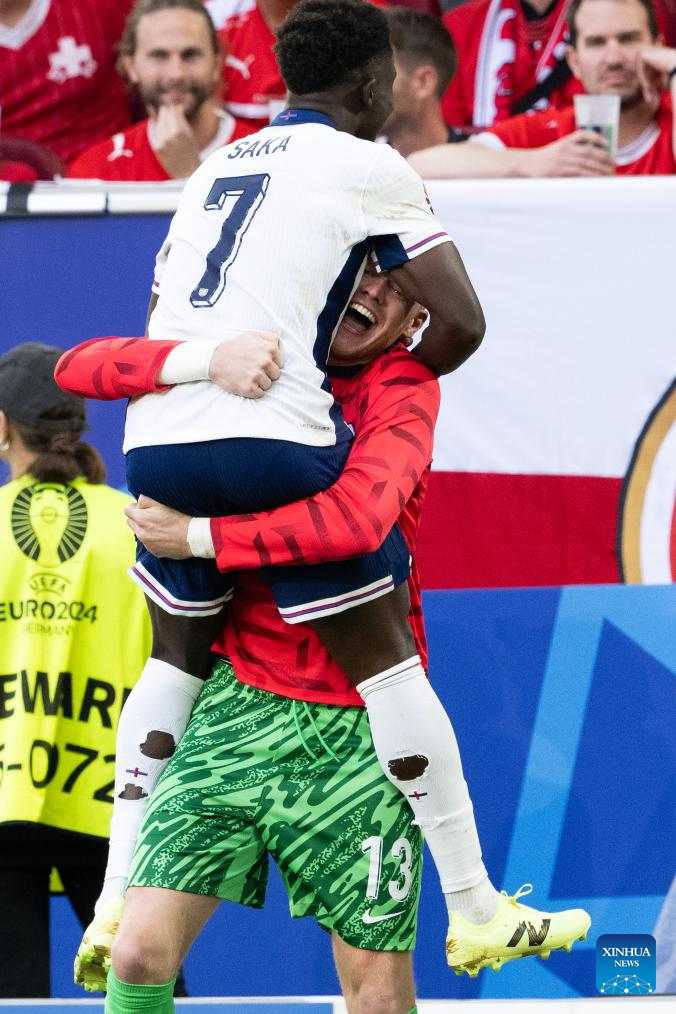 DUSSELDORF, 7 julio, 2024 (Xinhua) -- Imagen del 6 de julio de 2024 de Bukayo Saka (frente), de Inglaterra, festejando su anotación con Aaron Rasmdale durante el partido correspondiente a los cuartos de final de la EURO 2024 de la UEFA, entre Inglaterra y Suiza, en Dusseldorf, Alemania. (Xinhua/Xiao Yijiu)