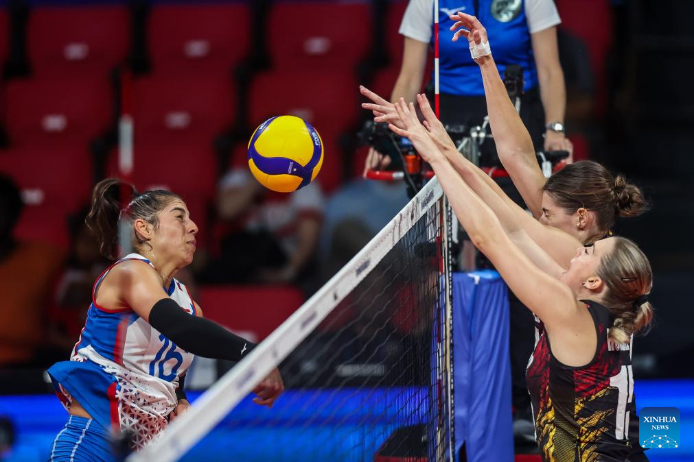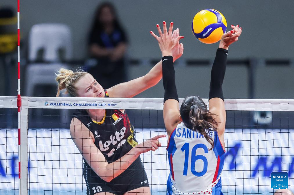 MANILA, 6 julio, 2024 (Xinhua) -- Pauline Martin (i), de Bélgica, clava el balón durante el partido entre Puerto Rico y Bélgica en la Copa Challenger de Voleibol Femenino de la FIVB 2024, en Manila, Filipinas, el 6 de julio de 2024. (Xinhua/Rouelle Umali)