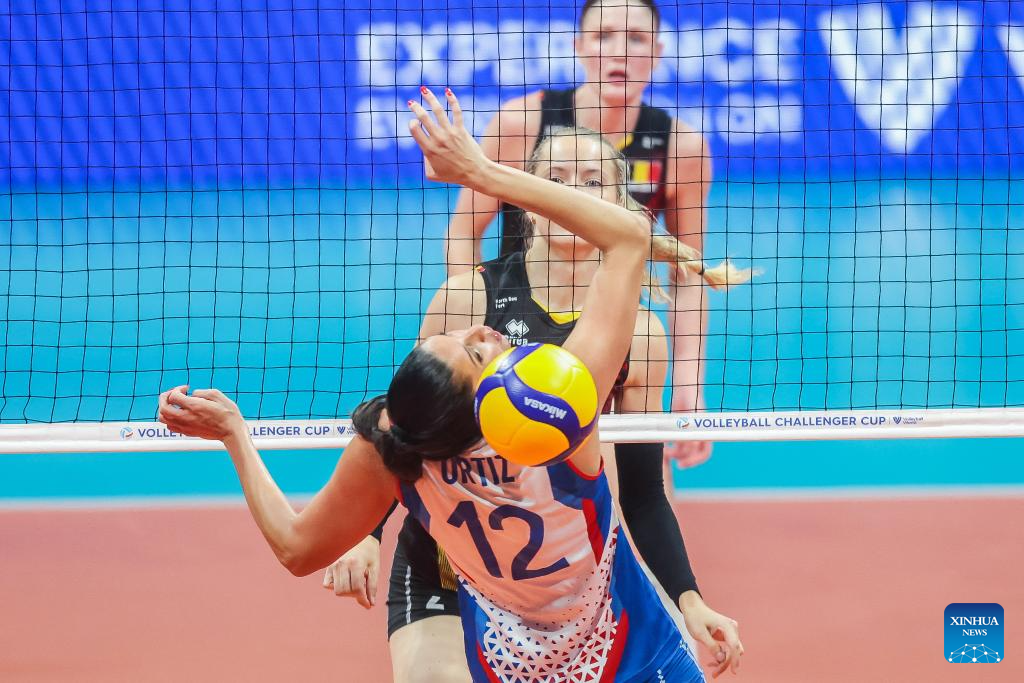 MANILA, 6 julio, 2024 (Xinhua) -- Shara Venegas (d), de Puerto Rico, devuelve el balón durante el partido entre Puerto Rico y Bélgica en la Copa Challenger de Voleibol Femenino de la FIVB 2024, en Manila, Filipinas, el 6 de julio de 2024. (Xinhua/Rouelle Umali)