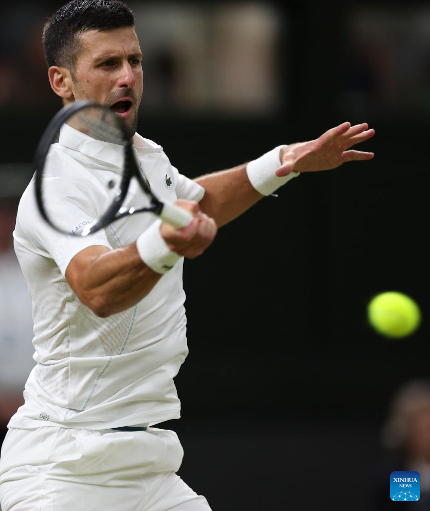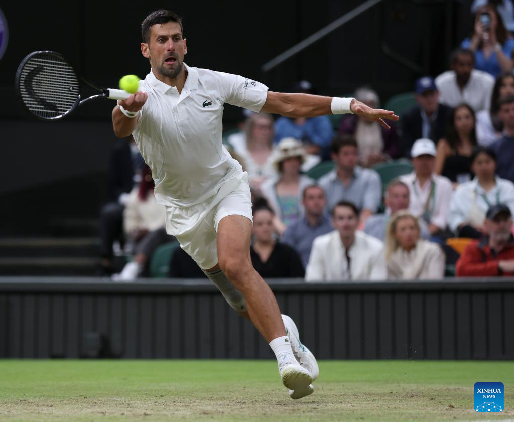 LONDRES, 7 julio, 2024 (Xinhua) -- Imagen del 6 de julio de 2024 de Novak Djokovic, devolviendo la pelota durante el partido de tercera ronda de individuales masculinos entre Novak Djokovic, de Serbia, y Alexei Popyrin, de Australia, en el Campeonato de Tenis de Wimbledon, en Londres, Reino Unido. (Xinhua/Han Yan)