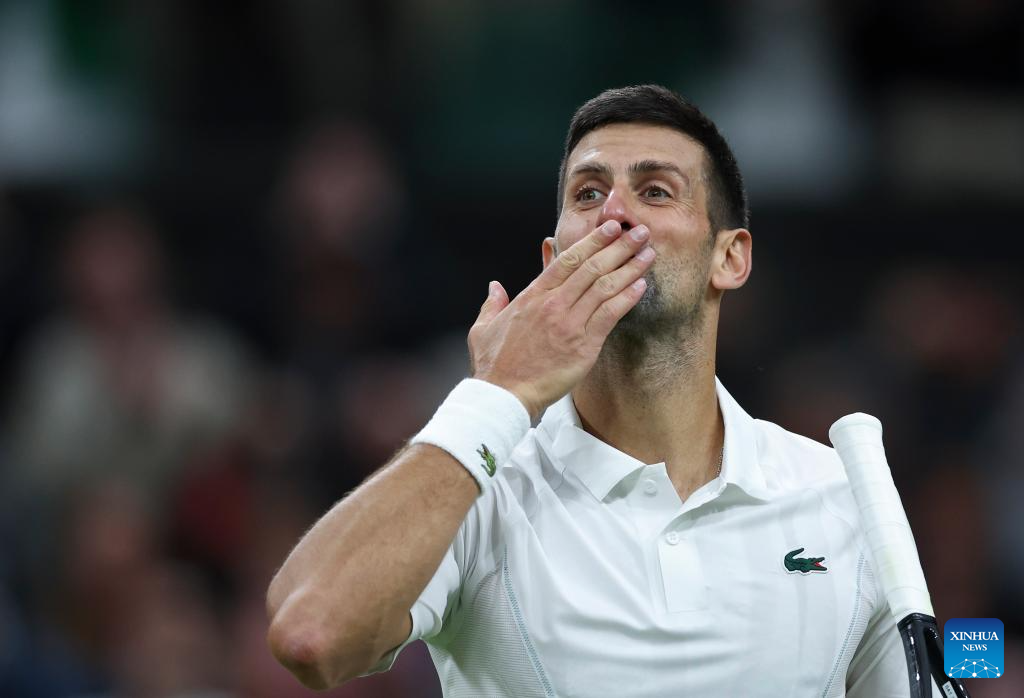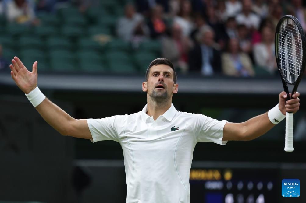 LONDRES, 7 julio, 2024 (Xinhua) -- Imagen del 6 de julio de 2024 de Novak Djokovic festejando al término del partido de tercera ronda de individuales masculinos entre Novak Djokovic, de Serbia, y Alexei Popyrin, de Australia, en el Campeonato de Tenis de Wimbledon, en Londres, Reino Unido. (Xinhua/Han Yan)