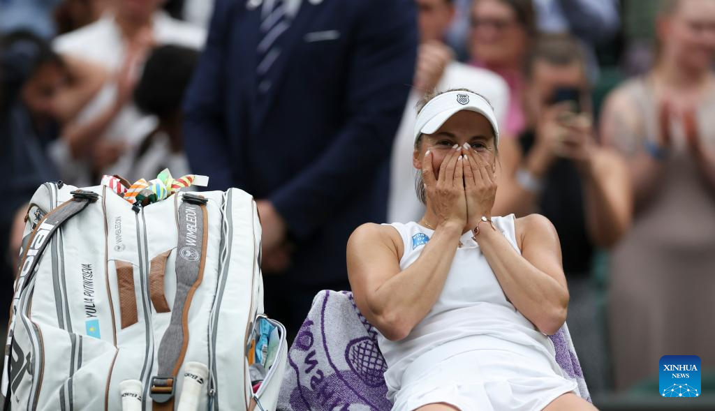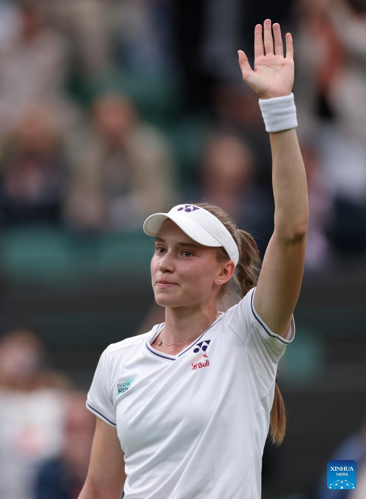 LONDRES, 7 julio, 2024 (Xinhua) -- Imagen del 6 de julio de 2024 de Elena Rybakina reaccionando después del partido de tercera ronda de individuales femeninos entre Elena Rybakina, de Kazajistán, y Caroline Wozniacki, de Dinamarca, en el Campeonato de Tenis de Wimbledon, en Londres, Reino Unido. (Xinhua/Han Yan)