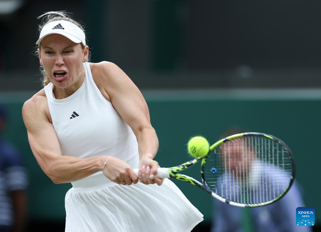 LONDRES, 7 julio, 2024 (Xinhua) -- Imagen del 6 de julio de 2024 de Caroline Wozniacki devolviendo la pelota durante el partido de tercera ronda de individuales femeninos entre Elena Rybakina, de Kazajistán, y Caroline Wozniacki, de Dinamarca, en el Campeonato de Tenis de Wimbledon, en Londres, Reino Unido. (Xinhua/Han Yan)