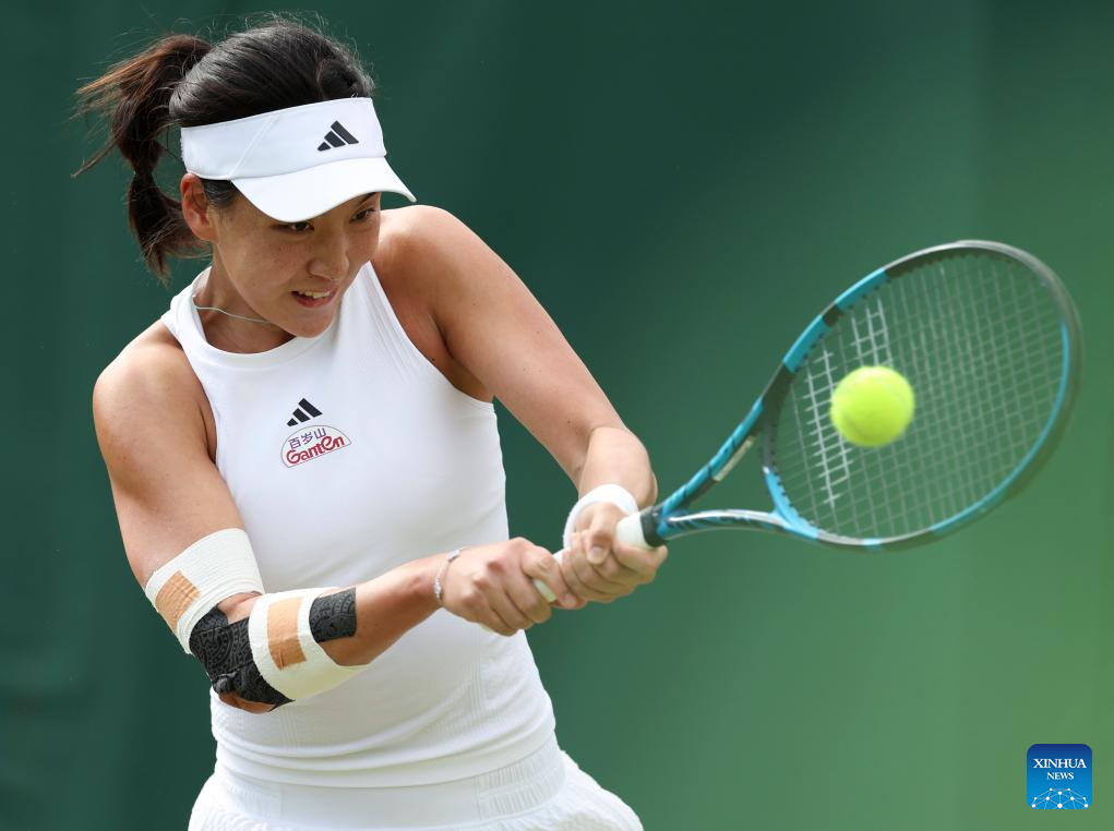 LONDRES, 7 julio, 2024 (Xinhua) -- Imagen del 6 de julio de 2024 de Wang Xinyu devolviendo la pelota durante el partido de tercera ronda de individuales femeninos entre Wang Xinyu, de China, y Harriet Dart, de Reino Unido, en el Campeonato de Tenis de Wimbledon, en Londres, Reino Unido. (Xinhua/Han Yan)