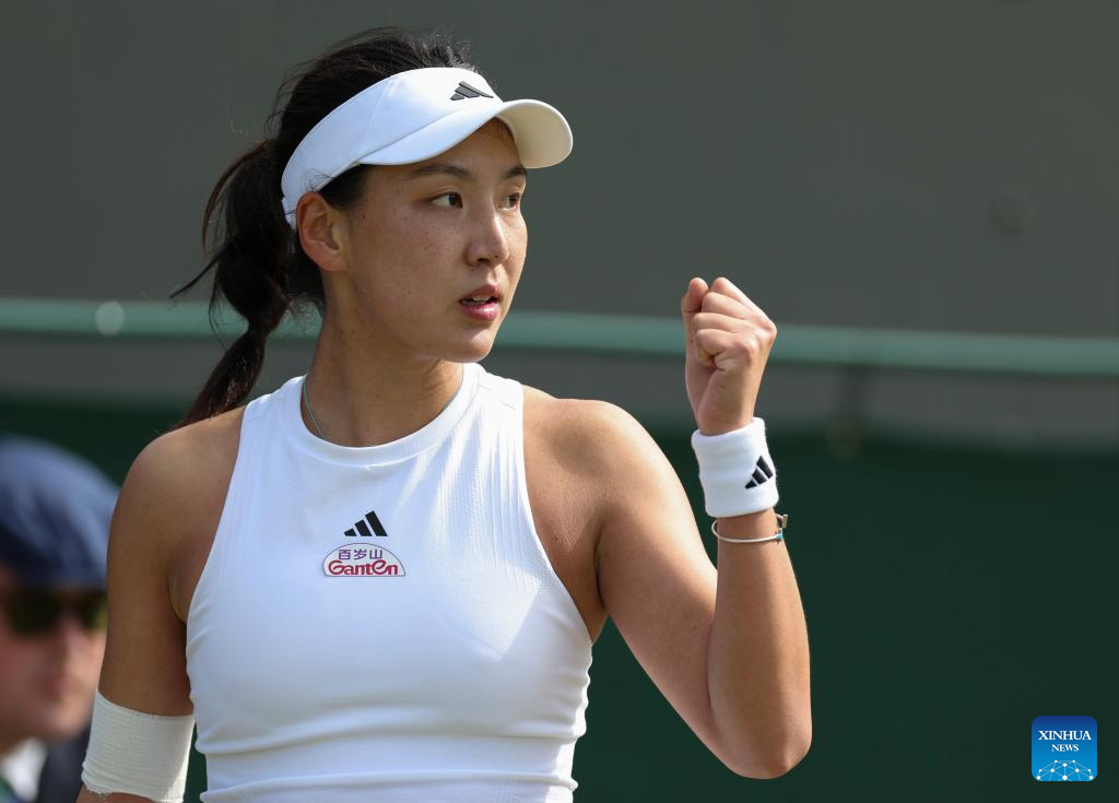 LONDRES, 7 julio, 2024 (Xinhua) -- Imagen del 6 de julio de 2024 de Wang Xinyu festejando durante el partido de tercera ronda de individuales femeninos entre Wang Xinyu, de China, y Harriet Dart, de Reino Unido, en el Campeonato de Tenis de Wimbledon, en Londres, Reino Unido. (Xinhua/Han Yan)