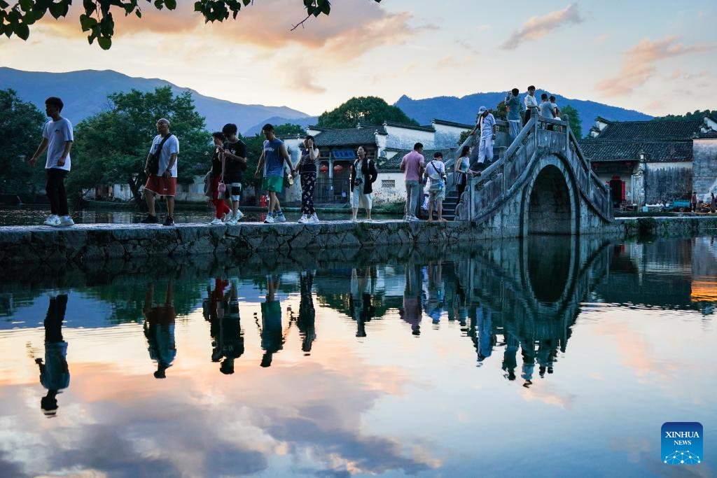 YIXIAN, 8 julio, 2024 (Xinhua) -- Imagen del 7 de julio de 2024 de turistas caminando sobre un puente, en la aldea de Hongcun del distrito de Yixian, en la provincia de Anhui, en el este de China. (Xinhua/Du Yu)