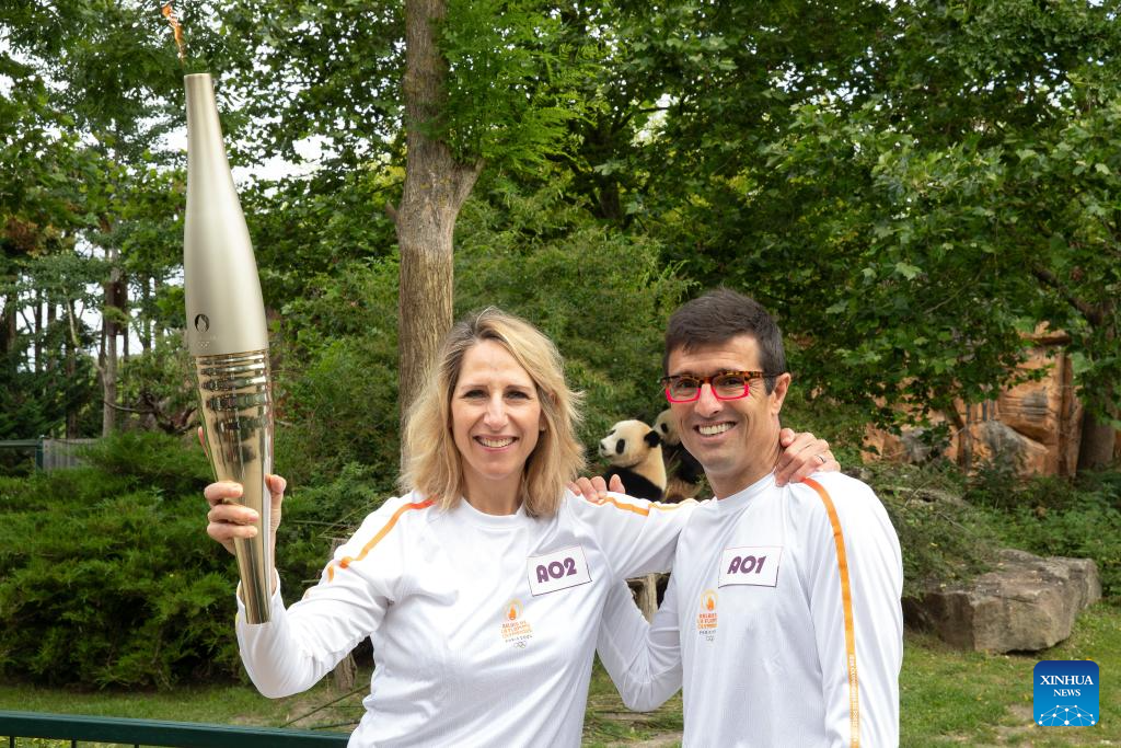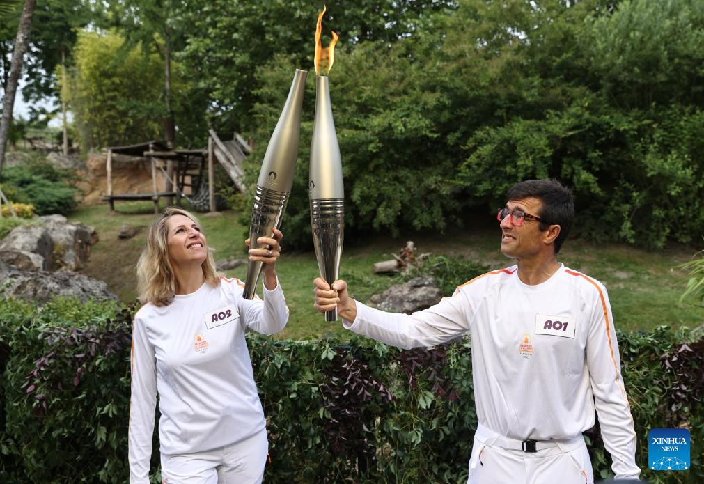 SAINT-AIGNAN, 8 julio, 2024 (Xinhua) -- Rodolphe Delord (d), director general del zoológico de Beauval, pasa la antorcha olímpica de París 2024 a la navegante francesa, Maud Fontenoy durante el relevo de la llama olímpica de París 2024 en el zoológico de Beauval en Saint-Aignan, en el centro de Francia, el 8 de julio de 2024. (Xinhua/Gao Jing)