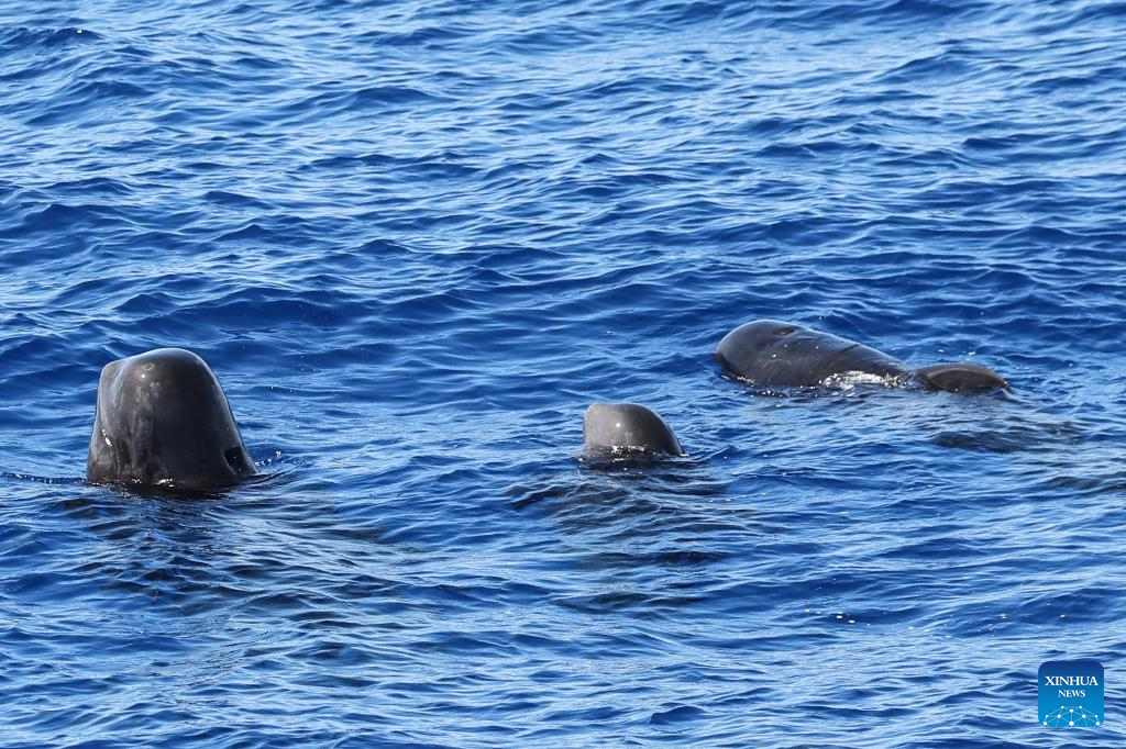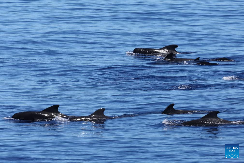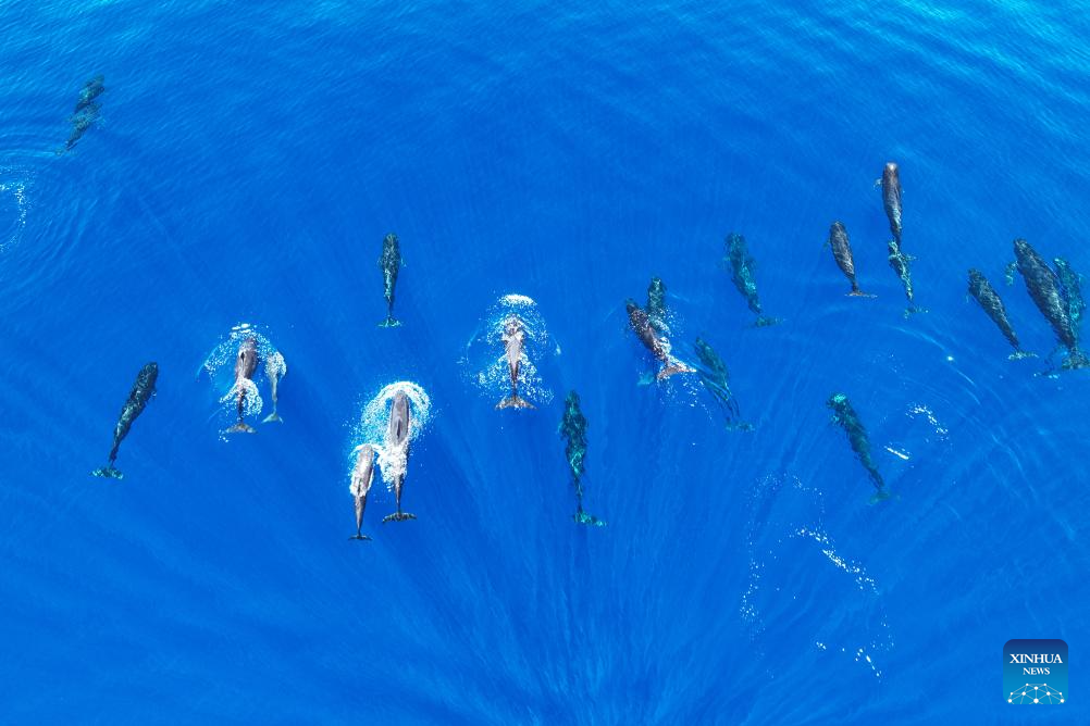 SANYA, 8 julio, 2024 (Xinhua) -- Imagen del 5 de julio de 2024 de ballenas piloto de aleta corta nadando en las aguas al este de la isla de Hainan, en el sur de China. Un equipo de expedición de biodiversidad marina ha observado recientemente un gran número de cetáceos en las aguas al este de la isla de Hainan, incluidas ballenas piloto de aleta corta, delfines de Fraser y delfines de dientes rugosos. Entre las especies de cetáceos, muchas parejas madre-hijo han sido avistadas. (Xinhua/Zhang Liyun)