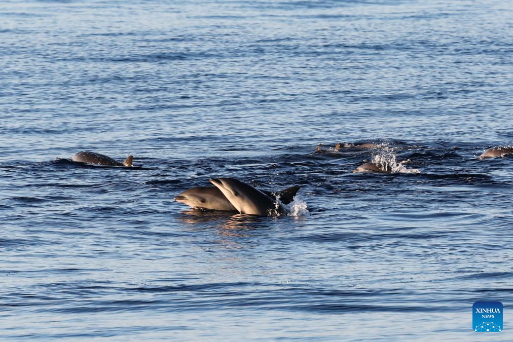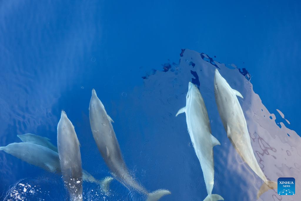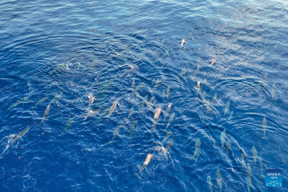 SANYA, 8 julio, 2024 (Xinhua) -- Imagen del 6 de julio de 2024 de delfines de Fraser nadando en las aguas al este de la isla de Hainan, en el sur de China. Un equipo de expedición de biodiversidad marina ha observado recientemente un gran número de cetáceos en las aguas al este de la isla de Hainan, incluidas ballenas piloto de aleta corta, delfines de Fraser y delfines de dientes rugosos. Entre las especies de cetáceos, muchas parejas madre-hijo han sido avistadas. (Xinhua/Zhang Liyun)