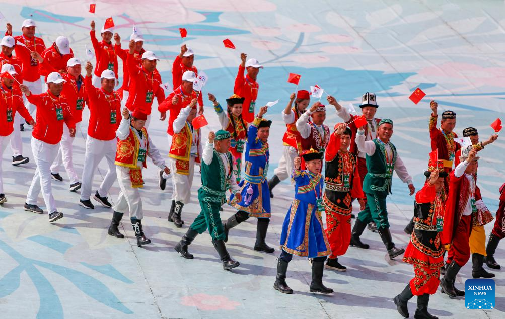 ZHAOSU, 8 julio, 2024 (Xinhua) -- La delegación de la región autónoma uygur de Xinjiang saluda a los espectadores durante la ceremonia de apertura de los eventos ecuestres de los XII Juegos Tradicionales Nacionales de las Minorías Etnicas de China, en Zhaosu, en la región autónoma uygur de Xinjiang, en el noroeste de China, el 8 de julio de 2024. Los eventos ecuestres, los primeros en comenzar en los Juegos Etnicos de este año, se desarrollarán hasta el 13 de julio. (Xinhua/Chen Shuo)