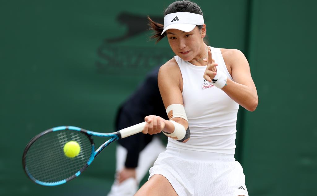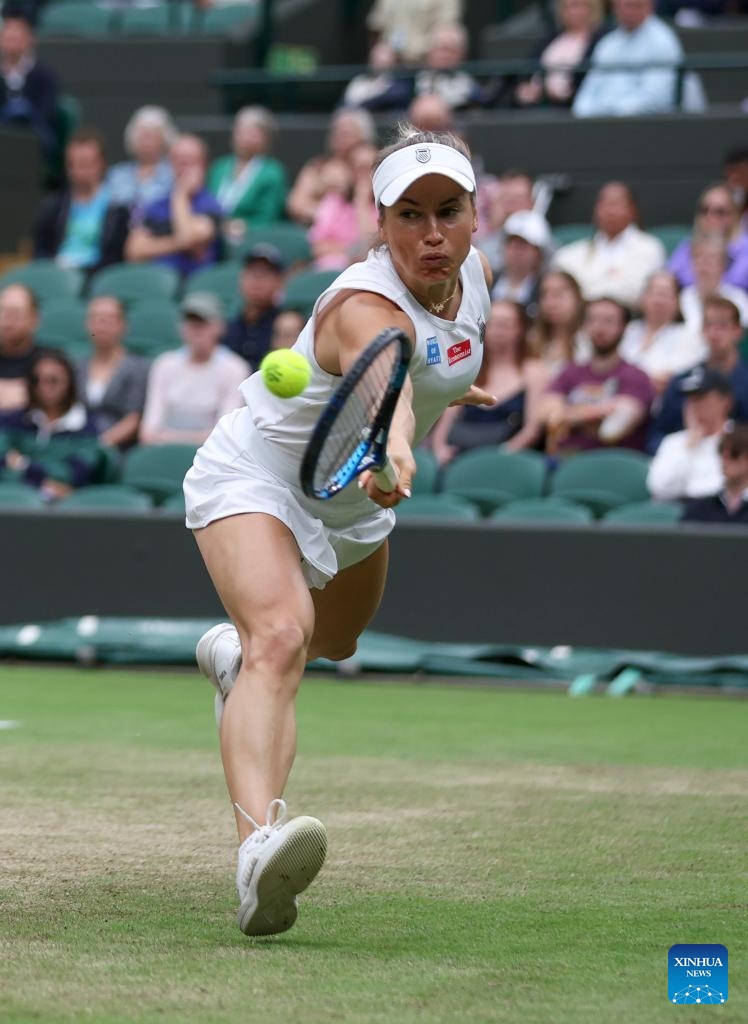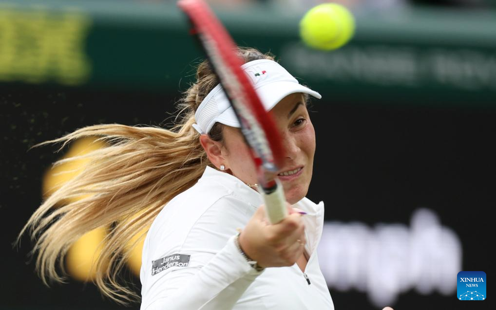LONDRES, 9 julio, 2024 (Xinhua) -- Donna Vekic devuelve la pelota durante el partido de cuartos de final de individuales femeninos entre Sun Lulu, de Nueva Zelanda, y Donna Vekic, de Croacia, en el Campeonato de Tenis de Wimbledon, en Londres, Reino Unido, el 9 de julio de 2024. (Xinhua/Li Ying)