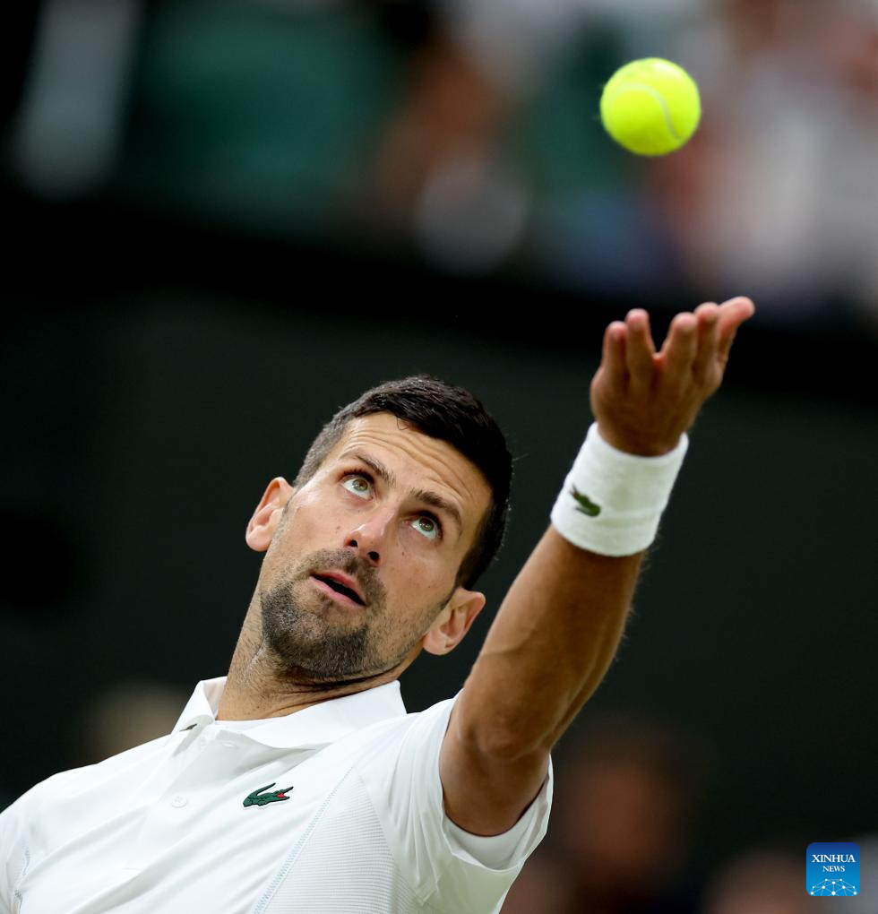LONDRES, 9 julio, 2024 (Xinhua) -- Imagen del 8 de julio de 2024 de Novak Djokovic sirviendo la pelota durante el partido de la cuarta ronda de individuales masculinos entre Novak Djokovic, de Serbia, y Holger Rune, de Dinamarca, en el Campeonato de Tenis de Wimbledon, en Londres, Reino Unido. (Xinhua/Li Ying)