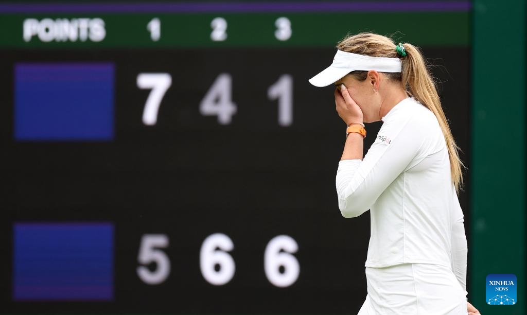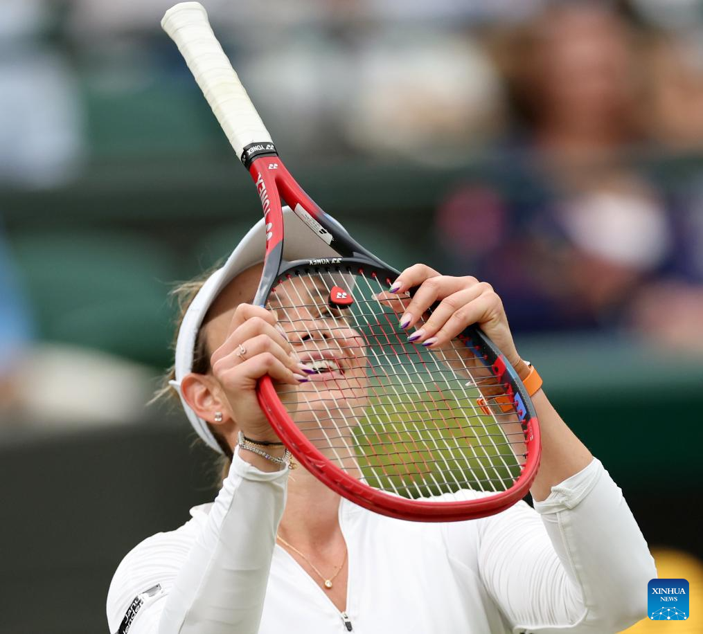 LONDRES, 9 julio, 2024 (Xinhua) -- Donna Vekic reacciona tras ganar el partido de cuartos de final de individuales femeninos entre Sun Lulu, de Nueva Zelanda, y Donna Vekic, de Croacia, en el Campeonato de Tenis de Wimbledon, en Londres, Reino Unido, el 9 de julio de 2024. (Xinhua/Li Ying)