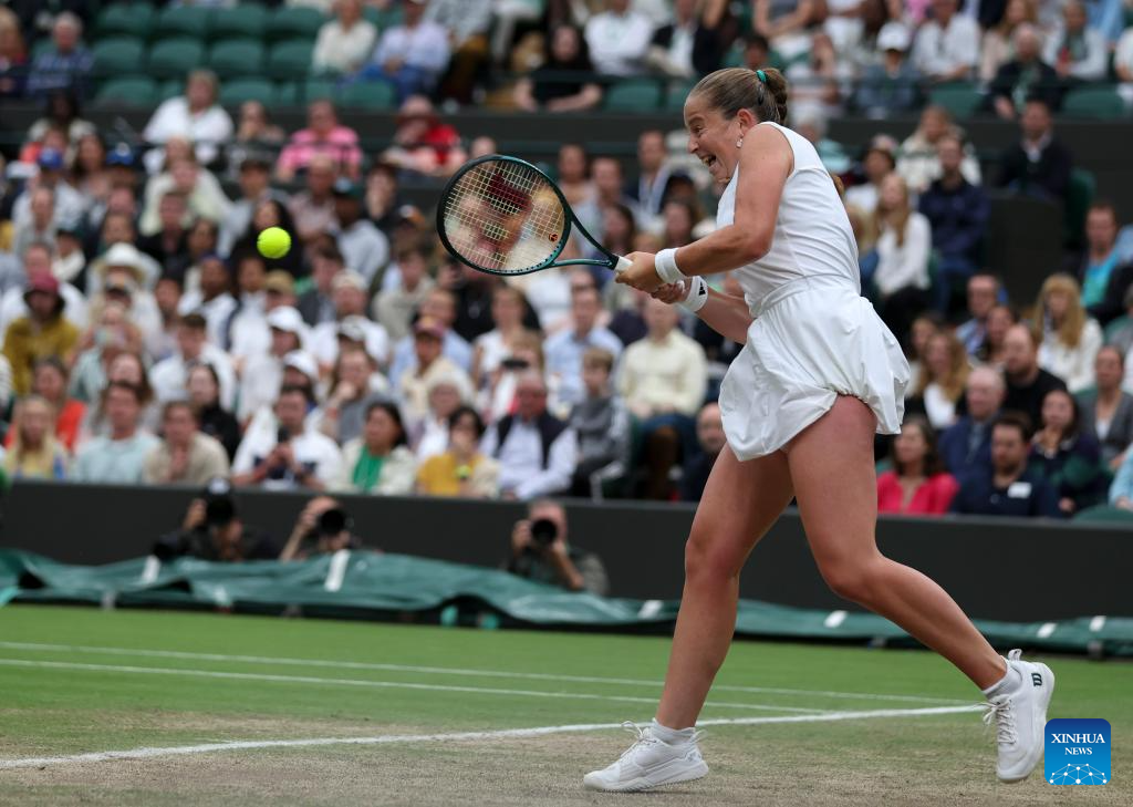 LONDRES, 9 julio, 2024 (Xinhua) -- Donna Vekic festeja tras ganar el partido de cuartos de final de individuales femeninos entre Sun Lulu, de Nueva Zelanda, y Donna Vekic, de Croacia, en el Campeonato de Tenis de Wimbledon, en Londres, Reino Unido, el 9 de julio de 2024. (Xinhua/Li Ying)