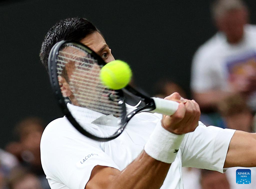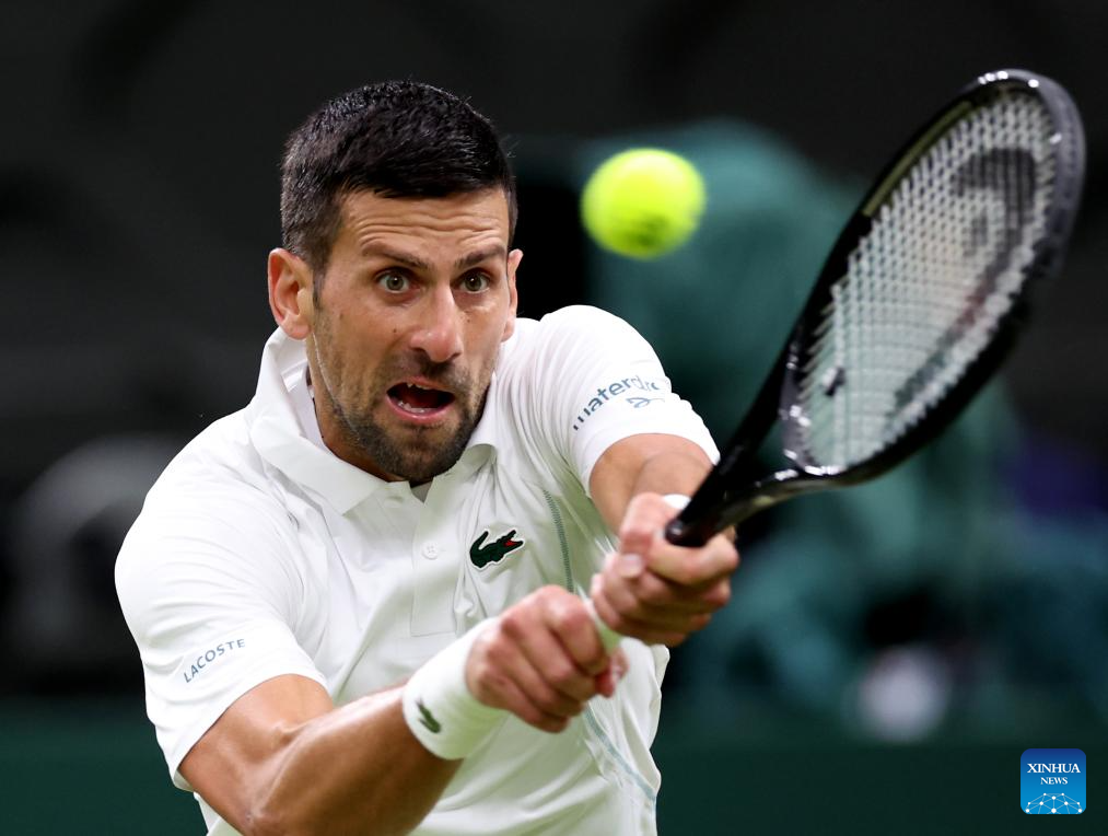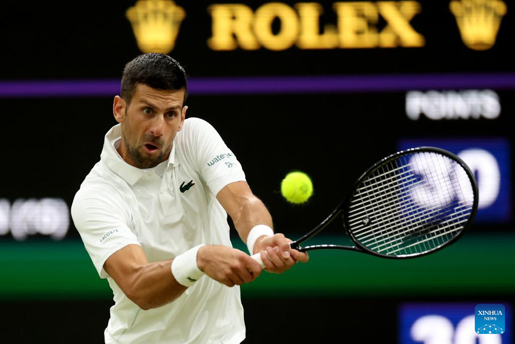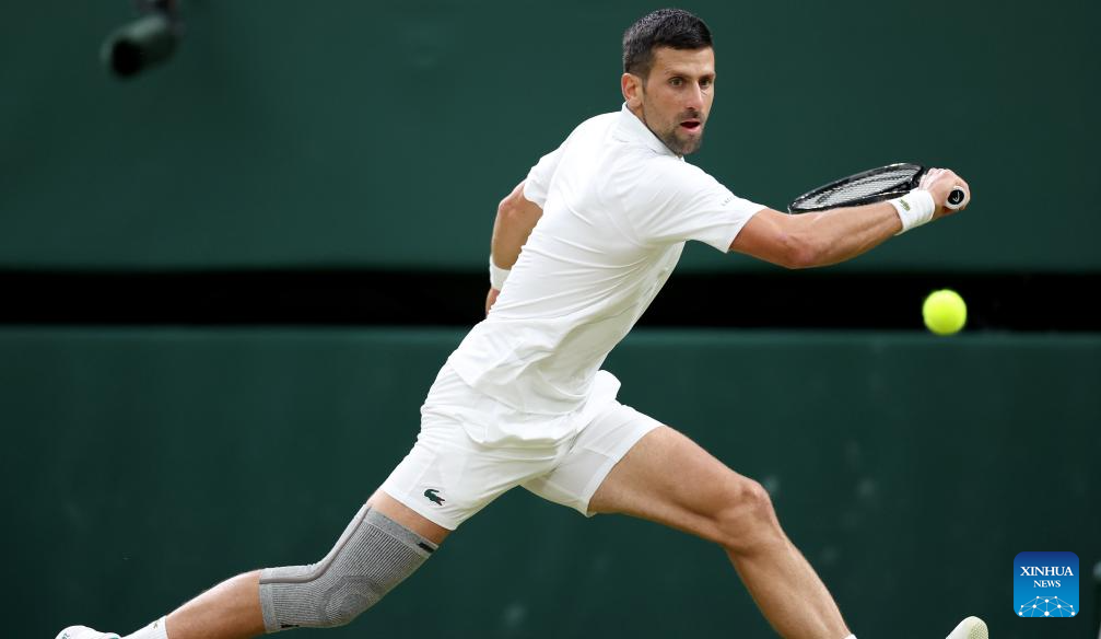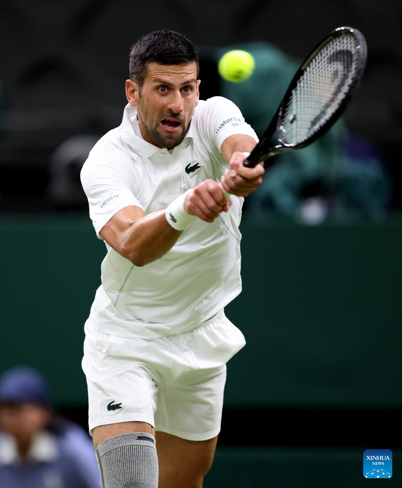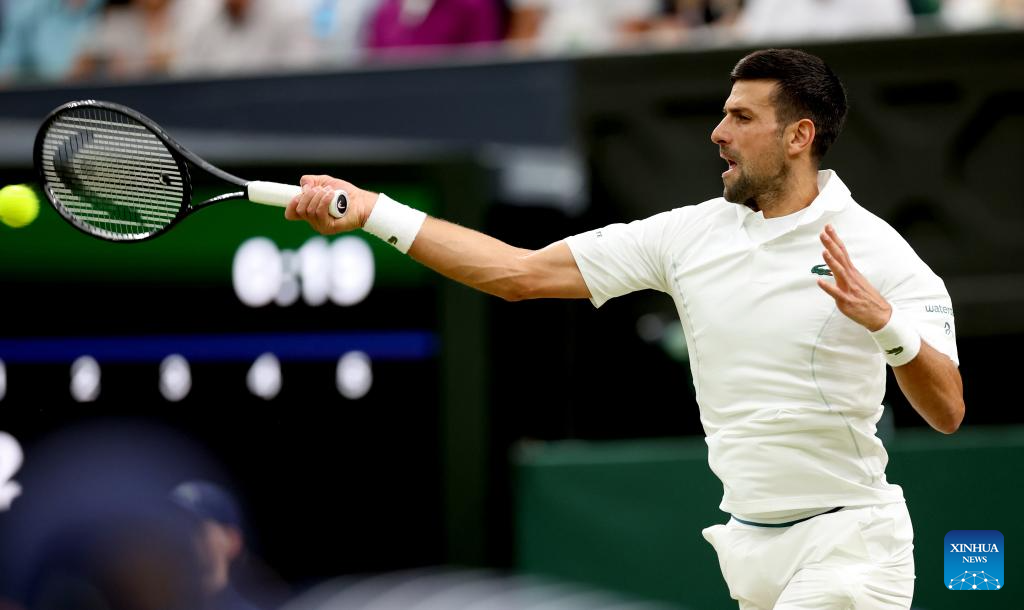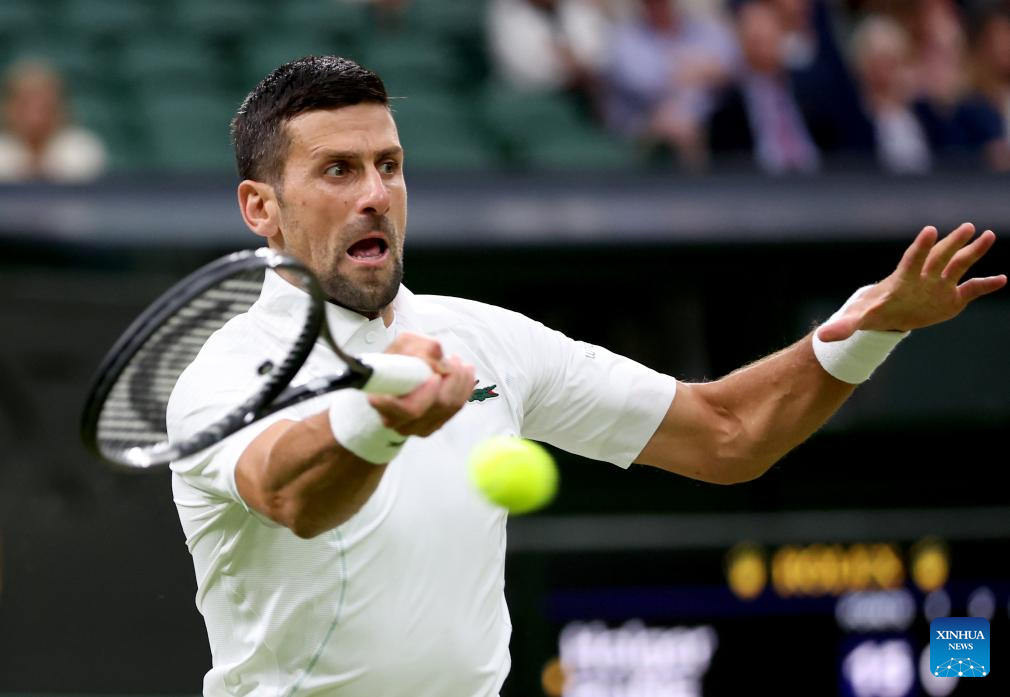 LONDRES, 9 julio, 2024 (Xinhua) -- Imagen del 8 de julio de 2024 de Novak Djokovic devolviendo la pelota durante el partido de la cuarta ronda de individuales masculinos entre Novak Djokovic, de Serbia, y Holger Rune, de Dinamarca, en el Campeonato de Tenis de Wimbledon, en Londres, Reino Unido. (Xinhua/Li Ying)