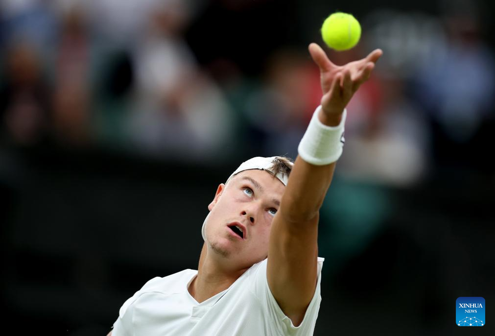 LONDRES, 9 julio, 2024 (Xinhua) -- Imagen del 8 de julio de 2024 de Holger Rune sirviendo la pelota durante el partido de la cuarta ronda de individuales masculinos entre Novak Djokovic, de Serbia, y Holger Rune, de Dinamarca, en el Campeonato de Tenis de Wimbledon, en Londres, Reino Unido. (Xinhua/Li Ying)