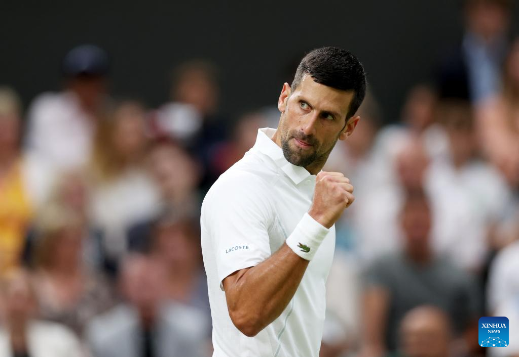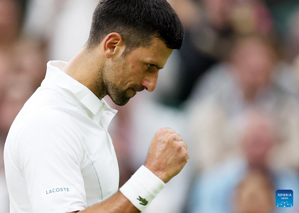 LONDRES, 9 julio, 2024 (Xinhua) -- Imagen del 8 de julio de 2024 de Novak Djokovic festejando un punto durante el partido de la cuarta ronda de individuales masculinos entre Novak Djokovic, de Serbia, y Holger Rune, de Dinamarca, en el Campeonato de Tenis de Wimbledon, en Londres, Reino Unido. (Xinhua/Li Ying)