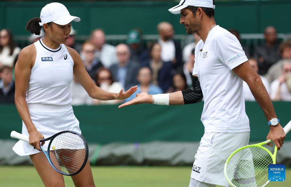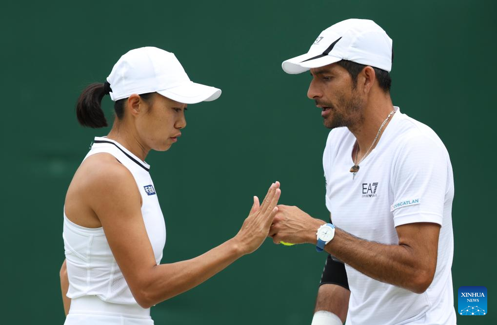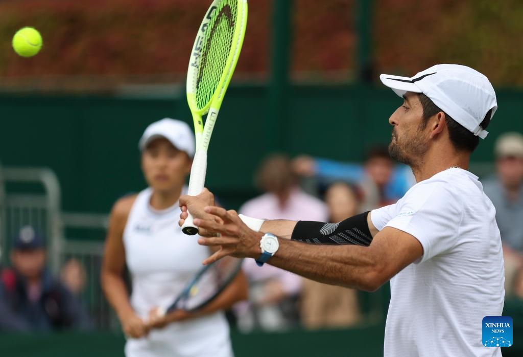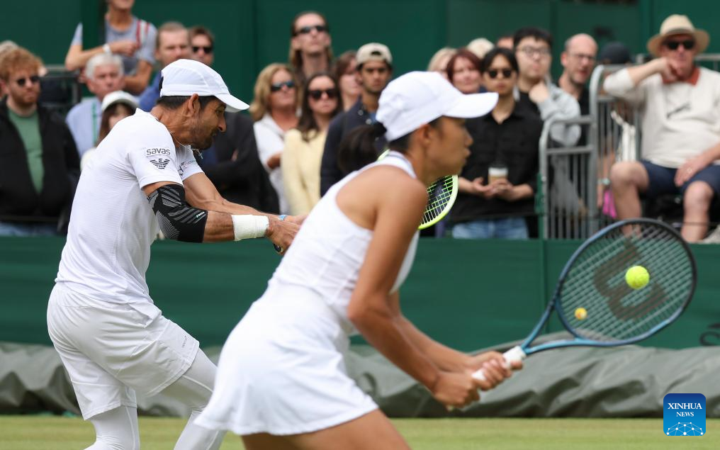LONDRES, 9 julio, 2024 (Xinhua) -- Imagen del 8 de julio de 2024 de Zhang Shuai/Marcelo Arévalo (i), compitiendo durante el partido de primera ronda de dobles mixtos entre Zhang Shuai (China)/Marcelo Arévalo (El Salvador), y Rajeev Ram/Katie Volynets, de Estados Unidos, en el Campeonato de Tenis de Wimbledon, en Londres, Reino Unido. (Xinhua/Han Yan)
