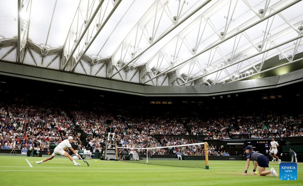 LONDRES, 9 julio, 2024 (Xinhua) -- Imagen del 8 de julio de 2024 de Holger Rune (i-frente) devolviendo la pelota durante el partido de la cuarta ronda de individuales masculinos entre Novak Djokovic, de Serbia, y Holger Rune, de Dinamarca, en el Campeonato de Tenis de Wimbledon, en Londres, Reino Unido. (Xinhua/Li Ying)