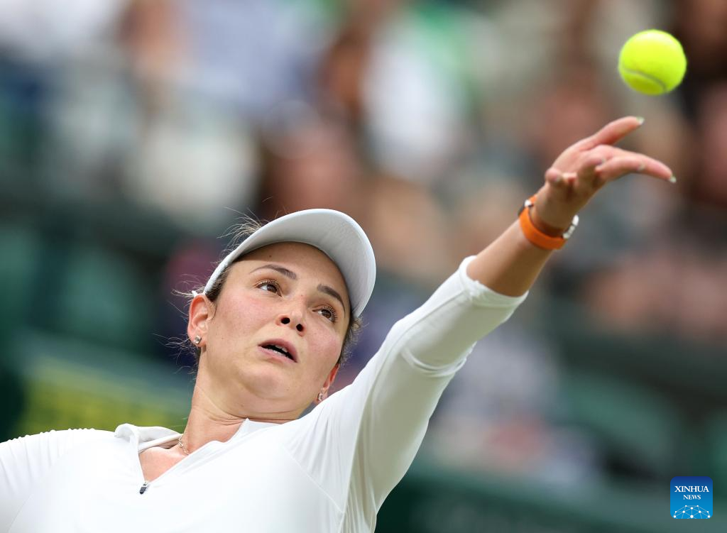 LONDRES, 9 julio, 2024 (Xinhua) -- Donna Vekic sirve la pelota durante el partido de cuartos de final de individuales femeninos entre Sun Lulu, de Nueva Zelanda, y Donna Vekic, de Croacia, en el Campeonato de Tenis de Wimbledon, en Londres, Reino Unido, el 9 de julio de 2024. (Xinhua/Li Ying)
