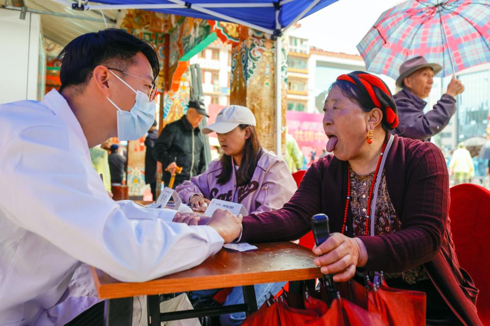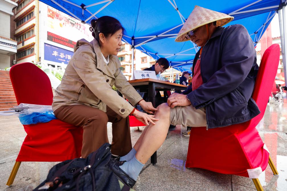 KANGDING, 9 julio, 2024 (Xinhua) -- Imagen del 8 de julio de 2024 de una voluntaria médica atendiendo a un residente local, en la ciudad de Kangding de la prefectura autónoma tibetana de Garze, en la provincia de Sichuan, en el suroeste de China. Una campaña de atención médica de bienestar público de una semana de duración comenzó aquí el lunes. Más de 800 voluntarios de 160 instituciones médicas de Beijing, Tianjin, Shanghai, Guangdong, entre otras, proporcionarán servicios de atención médica en 18 ciudades y distritos de la prefectura de Garze. (Xinhua/Shen Bohan)