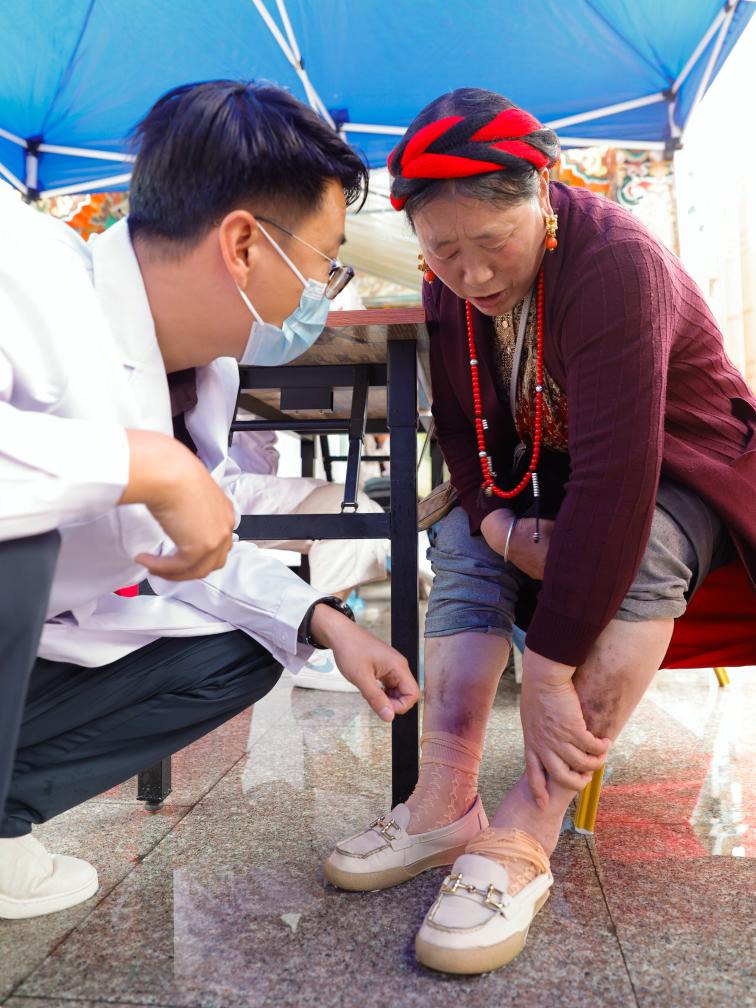 KANGDING, 9 julio, 2024 (Xinhua) -- Imagen del 8 de julio de 2024 de un voluntario médico atendiendo a una residente local, en la ciudad de Kangding de la prefectura autónoma tibetana de Garze, en la provincia de Sichuan, en el suroeste de China. Una campaña de atención médica de bienestar público de una semana de duración comenzó aquí el lunes. Más de 800 voluntarios de 160 instituciones médicas de Beijing, Tianjin, Shanghai, Guangdong, entre otras, proporcionarán servicios de atención médica en 18 ciudades y distritos de la prefectura de Garze. (Xinhua/Shen Bohan)