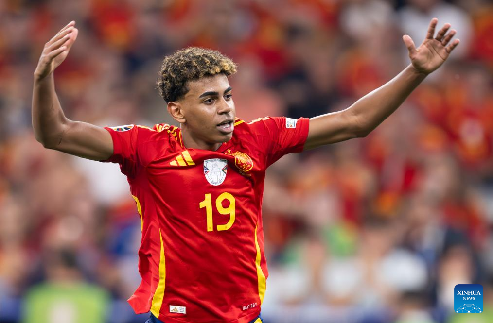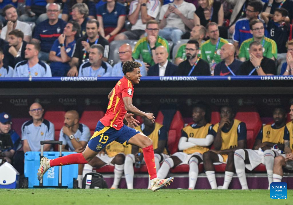 MUNICH, 10 julio, 2024 (Xinhua) -- Imagen del 9 de julio de 2024 de Lamine Yamal, de España, reaccionando durante el partido correspondiente a la semifinal de la EURO 2024 de la UEFA, entre España y Francia, en Múnich, Alemania. (Xinhua/Xiao Yijiu)