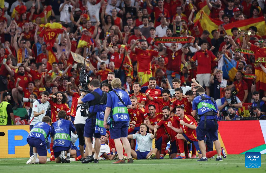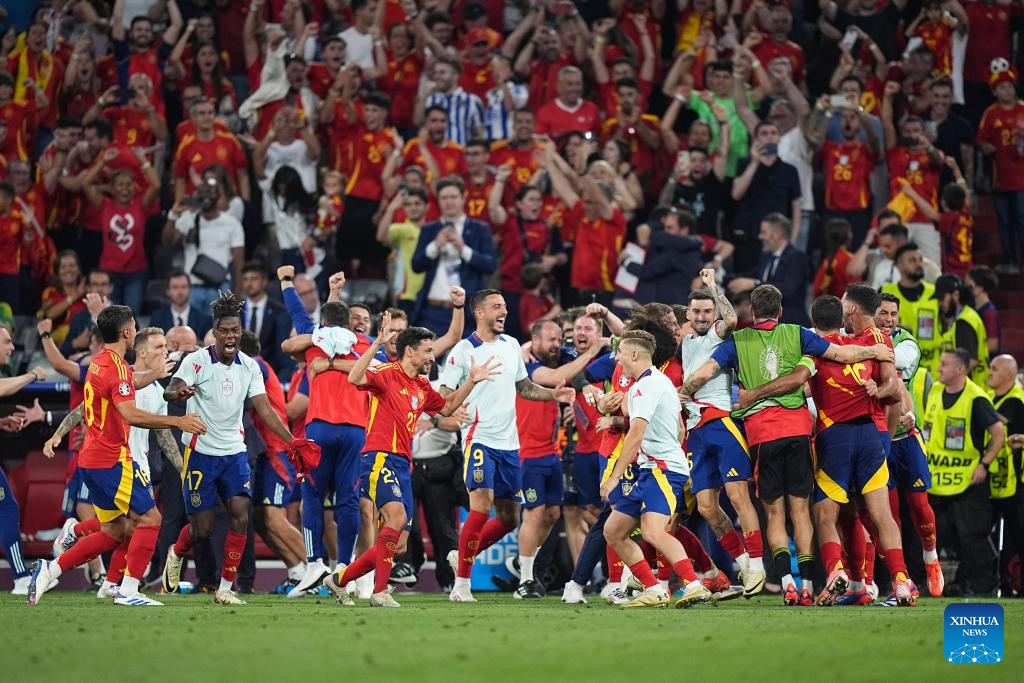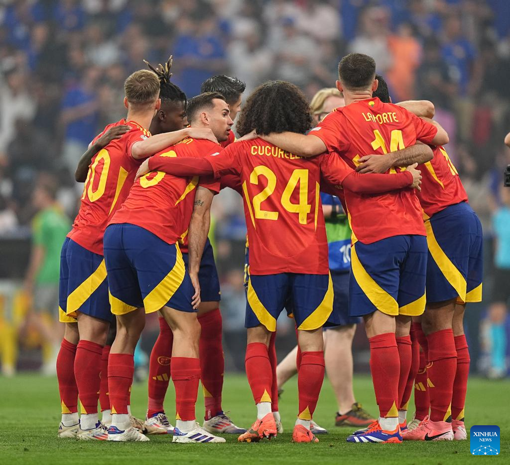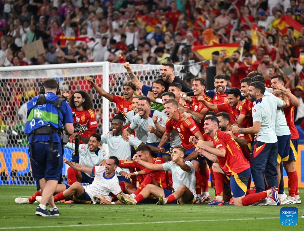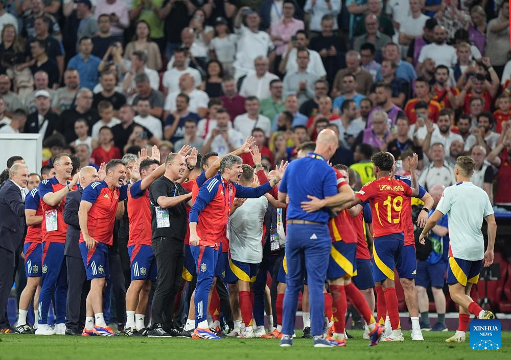MUNICH, 10 julio, 2024 (Xinhua) -- Imagen del 9 de julio de 2024 de jugadores de España festejando la victoria al término del partido correspondiente a la semifinal de la EURO 2024 de la UEFA, entre España y Francia, en Múnich, Alemania. (Xinhua/Zhang Fan)