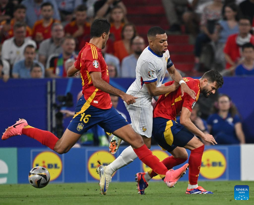 MUNICH, 10 julio, 2024 (Xinhua) -- Imagen del 9 de julio de 2024 de Kylian Mbappé (c), de Francia, compitiendo durante el partido correspondiente a la semifinal de la EURO 2024 de la UEFA, entre España y Francia, en Múnich, Alemania. (Xinhua/Ren Pengfei)