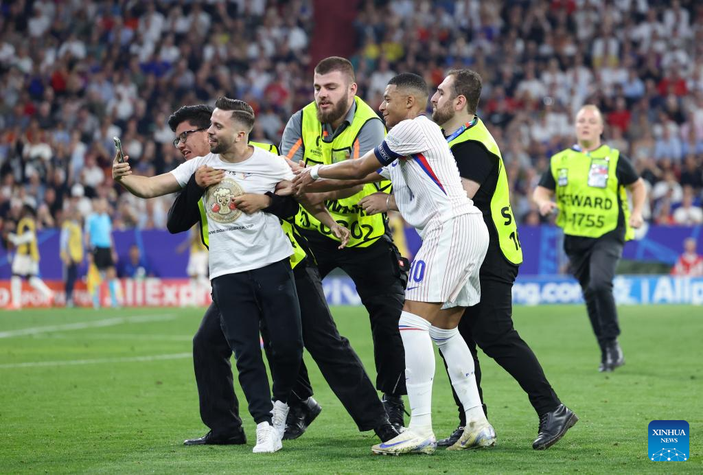 MUNICH, 10 julio, 2024 (Xinhua) -- Imagen del 9 de julio de 2024 de un hombre (2-i) tomándose fotografías con Kylian Mbappé (3-d), de Francia, después de entrar corriendo al campo durante el partido correspondiente a la semifinal de la EURO 2024 de la UEFA, entre España y Francia, en Múnich, Alemania. (Xinhua/Bai Xuefei)