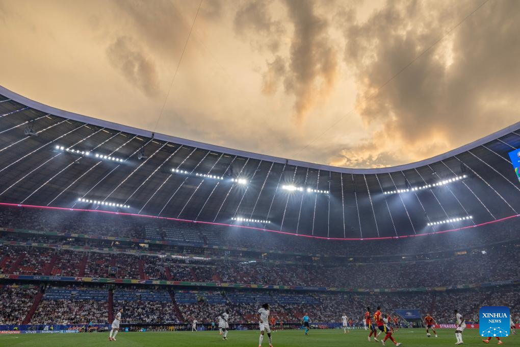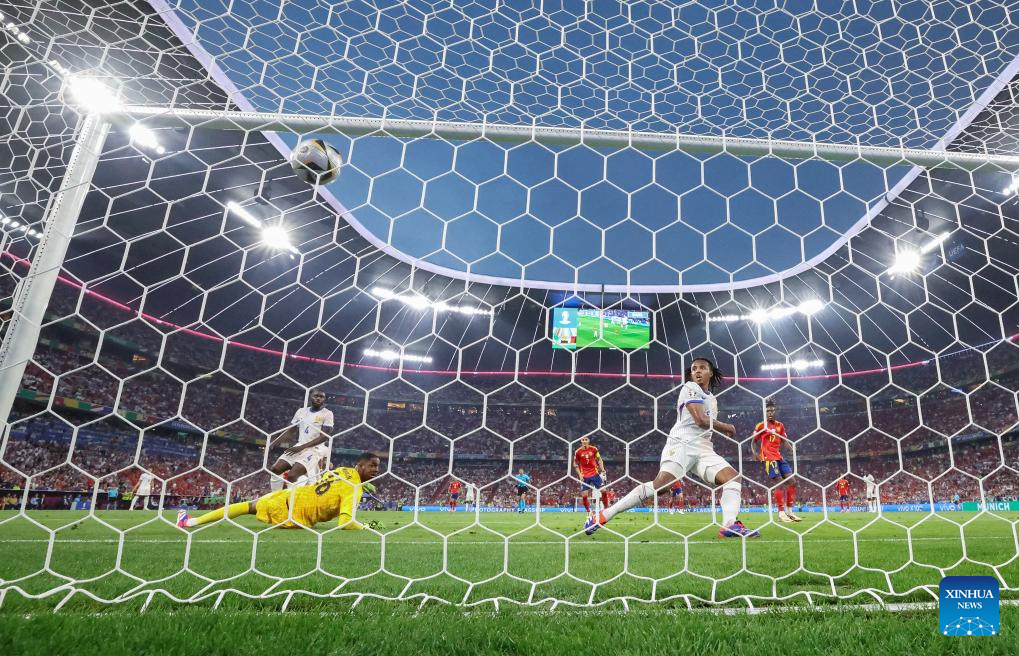 MUNICH, 10 julio, 2024 (Xinhua) -- Imagen del 9 de julio de 2024 de jugadores compitiendo durante el partido correspondiente a la semifinal de la EURO 2024 de la UEFA, entre España y Francia, en Múnich, Alemania. (Xinhua/Bai Xuefei)