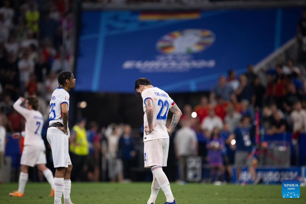 MUNICH, 10 julio, 2024 (Xinhua) -- Imagen del 9 de julio de 2024 de Theo Hernández (d) y Bradley Barcola, de Francia, reaccionando al término del partido correspondiente a la semifinal de la EURO 2024 de la UEFA, entre España y Francia, en Múnich, Alemania. (Xinhua/Xiao Yijiu)