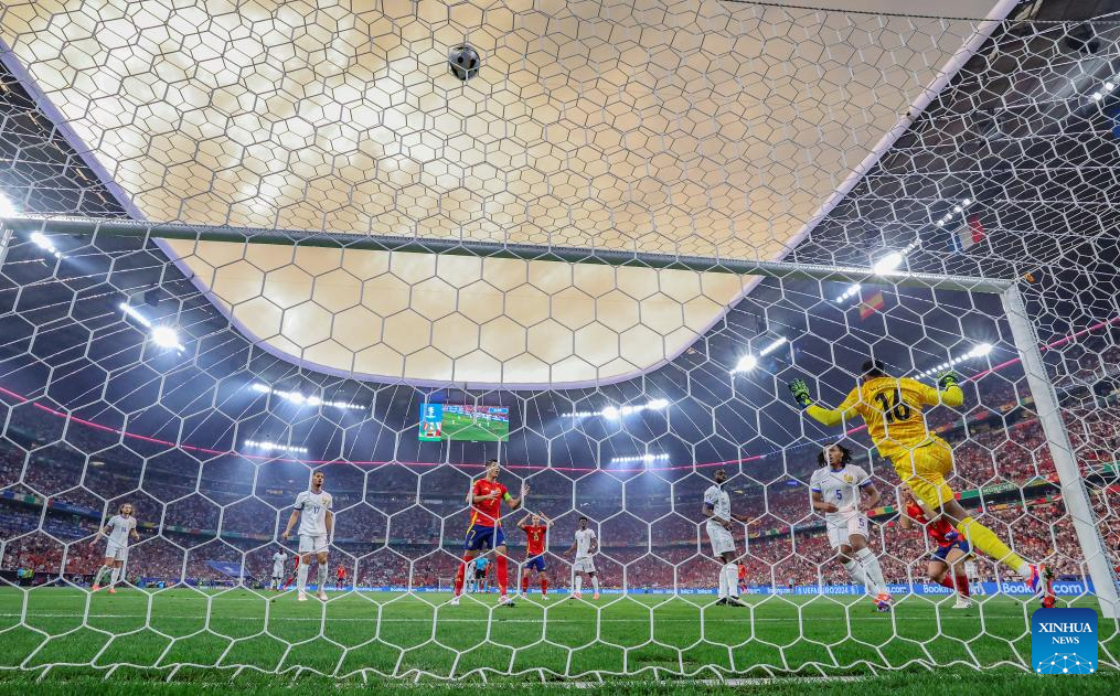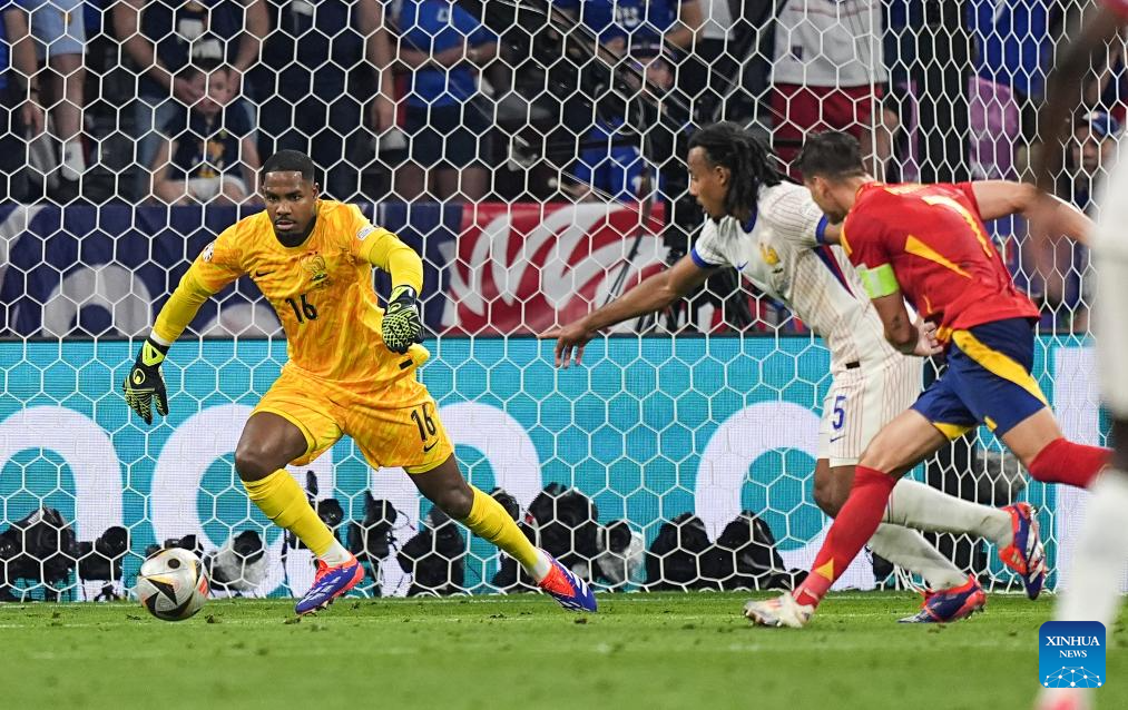MUNICH, 10 julio, 2024 (Xinhua) -- Imagen del 9 de julio de 2024 del guardameta Mike Maignan (d), de Francia, realizando una atajada durante el partido correspondiente a la semifinal de la EURO 2024 de la UEFA, entre España y Francia, en Múnich, Alemania. (Xinhua/Bai Xuefei)