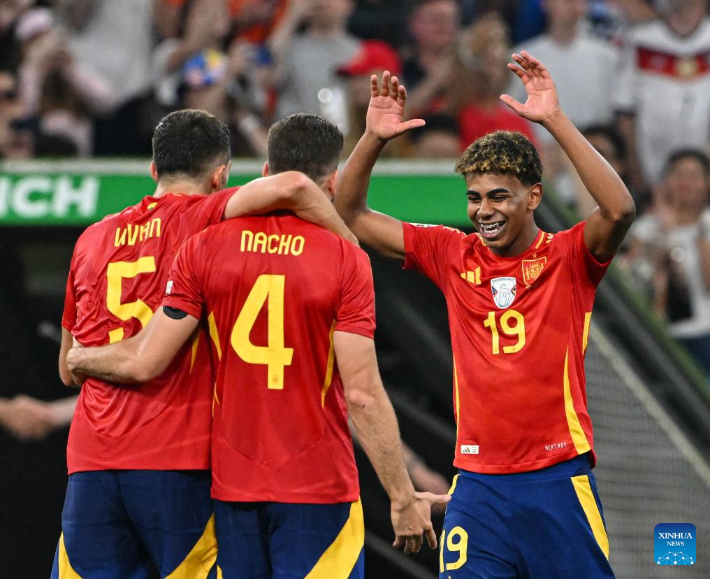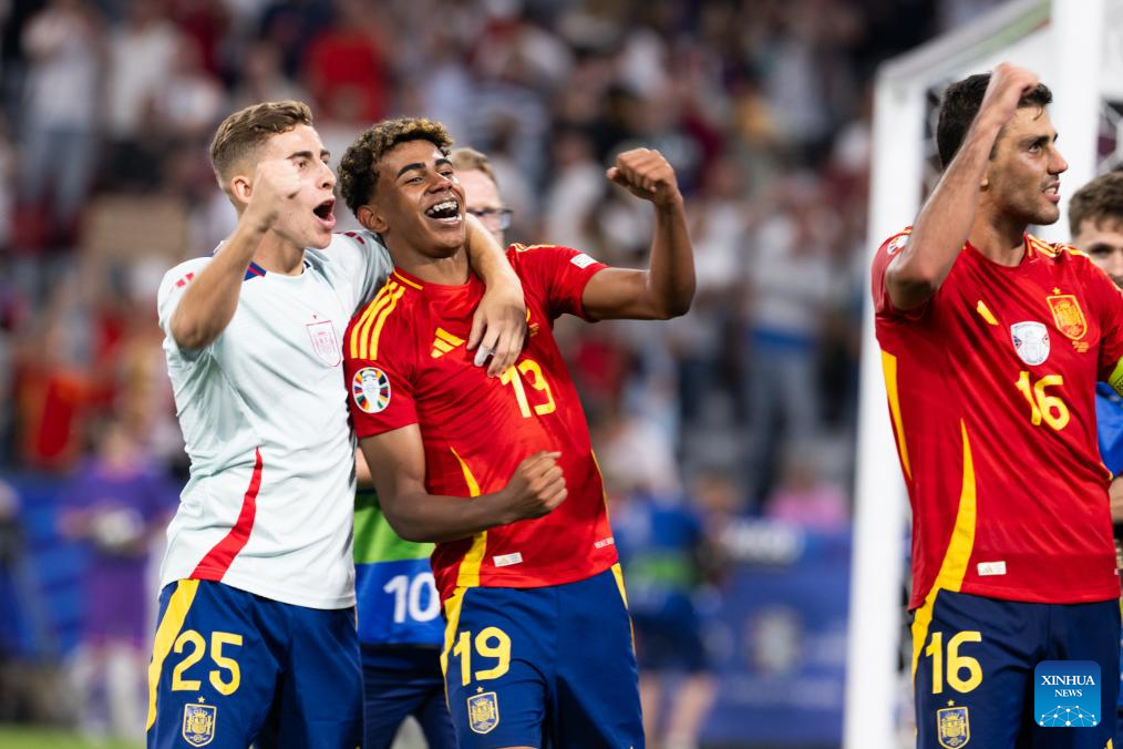 MUNICH, 10 julio, 2024 (Xinhua) -- Imagen del 9 de julio de 2024 de Lamine Yamal (2-d), de España, festejando la victoria con sus compañeros al término del partido correspondiente a la semifinal de la EURO 2024 de la UEFA, entre España y Francia, en Múnich, Alemania. (Xinhua/Zhang Fan)