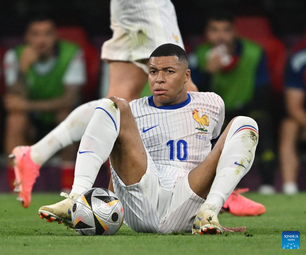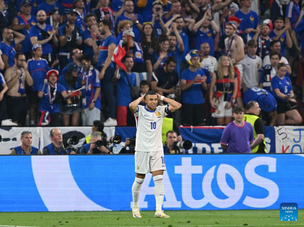 MUNICH, 10 julio, 2024 (Xinhua) -- Imagen del 9 de julio de 2024 de Kylian Mbappé, de Francia, reaccionando durante el partido correspondiente a la semifinal de la EURO 2024 de la UEFA, entre España y Francia, en Múnich, Alemania. (Xinhua/Ren Pengfei)