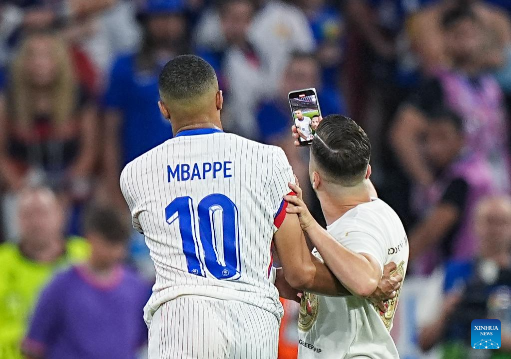 MUNICH, 10 julio, 2024 (Xinhua) -- Imagen del 9 de julio de 2024 de un aficionado (d) tomándose fotografías con Kylian Mbappé, de Francia, durante el partido correspondiente a la semifinal de la EURO 2024 de la UEFA, entre España y Francia, en Múnich, Alemania. (Xinhua/Zhang Fan)