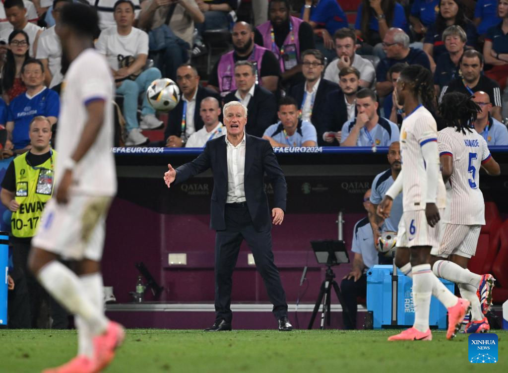 MUNICH, 10 julio, 2024 (Xinhua) -- Imagen del 9 de julio de 2024 del director técnico Didier Deschamps (c), de Francia, reaccionando durante el partido correspondiente a la semifinal de la EURO 2024 de la UEFA, entre España y Francia, en Múnich, Alemania. (Xinhua/Ren Pengfei)
