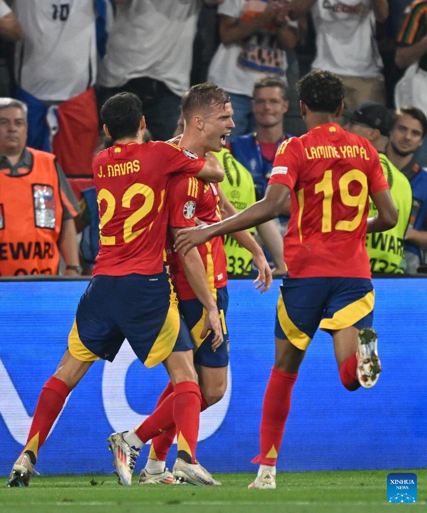 MUNICH, 10 julio, 2024 (Xinhua) -- Imagen del 9 de julio de 2024 de Daniel Olmo (c), de España, festejando su anotación con sus compañeros durante el partido correspondiente a la semifinal de la EURO 2024 de la UEFA, entre España y Francia, en Múnich, Alemania. (Xinhua/Ren Pengfei)