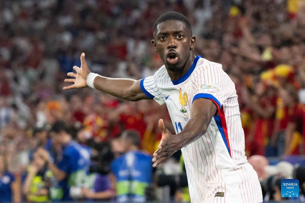 MUNICH, 10 julio, 2024 (Xinhua) -- Imagen del 9 de julio de 2024 de Ousmane Dembele, de Francia, reaccionando durante el partido correspondiente a la semifinal de la EURO 2024 de la UEFA, entre España y Francia, en Múnich, Alemania. (Xinhua/Xiao Yijiu)