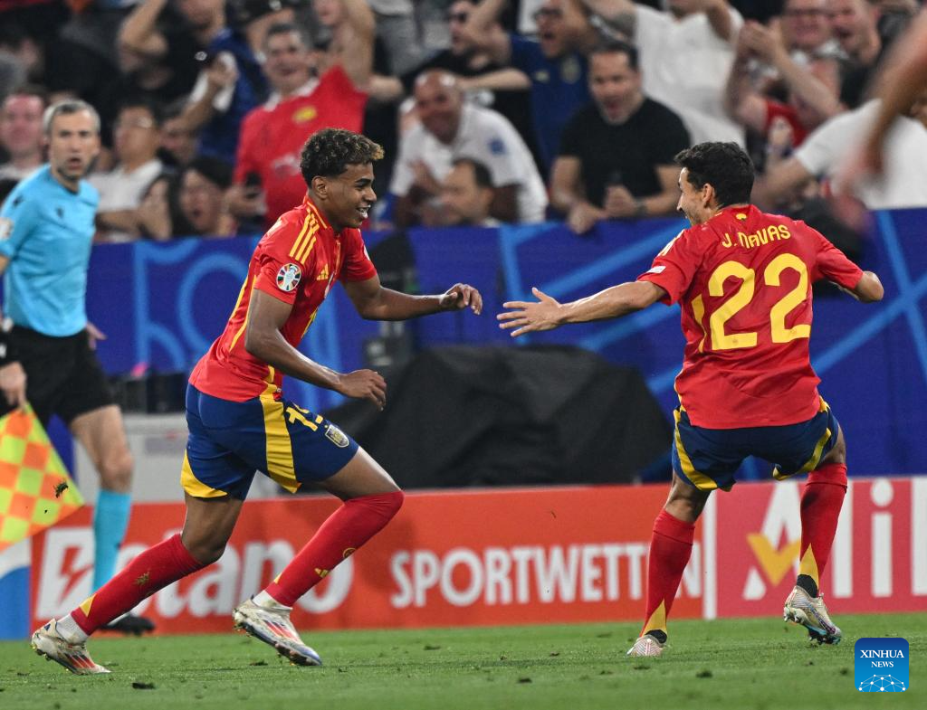 MUNICH, 10 julio, 2024 (Xinhua) -- Imagen del 9 de julio de 2024 de Lamine Yamal, de España, festejando su anotación durante el partido correspondiente a la semifinal de la EURO 2024 de la UEFA, entre España y Francia, en Múnich, Alemania. (Xinhua/Ren Pengfei)