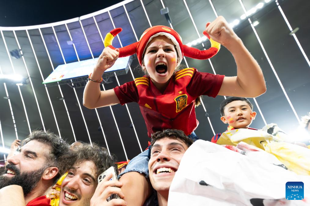 MUNICH, 10 julio, 2024 (Xinhua) -- Imagen del 9 de julio de 2024 de aficionados de España festejando al término del partido correspondiente a la semifinal de la EURO 2024 de la UEFA, entre España y Francia, en Múnich, Alemania. (Xinhua/Xiao Yijiu)