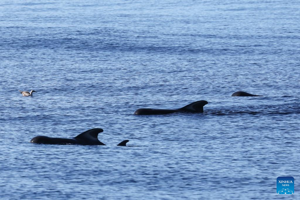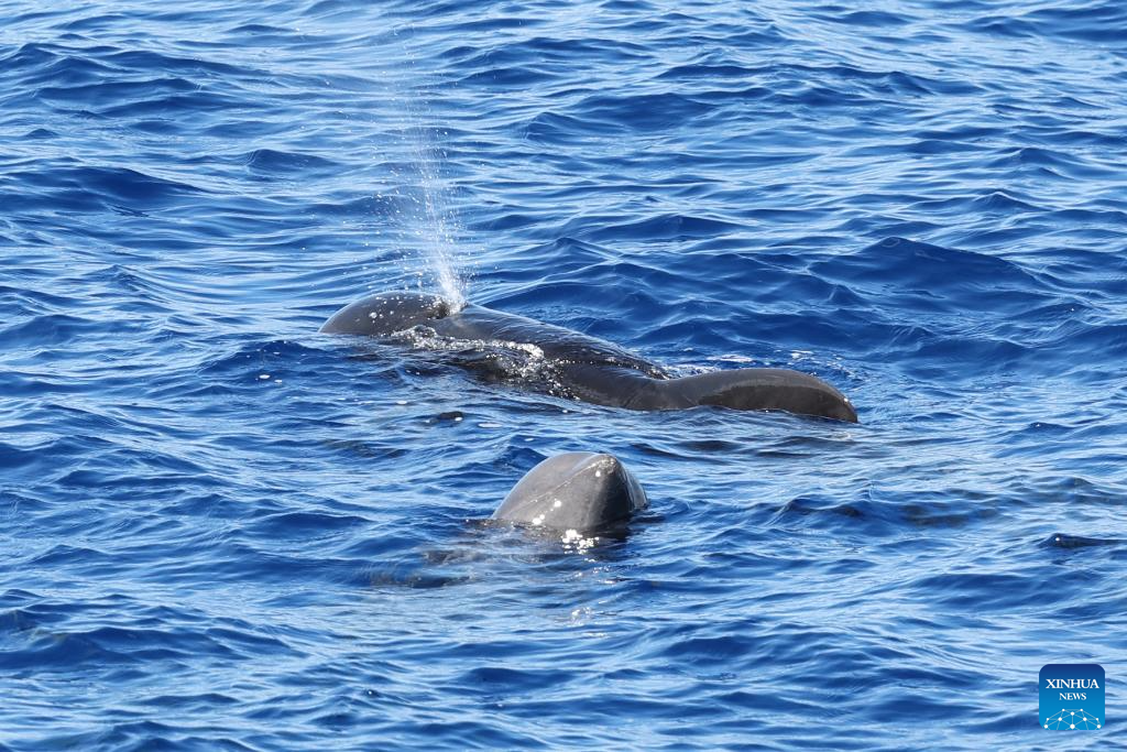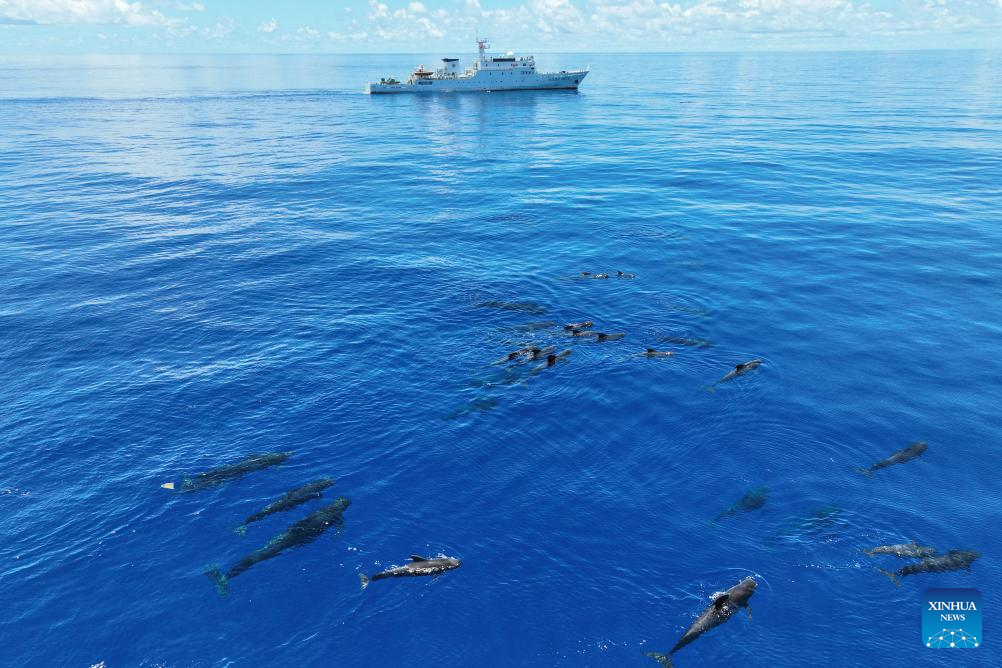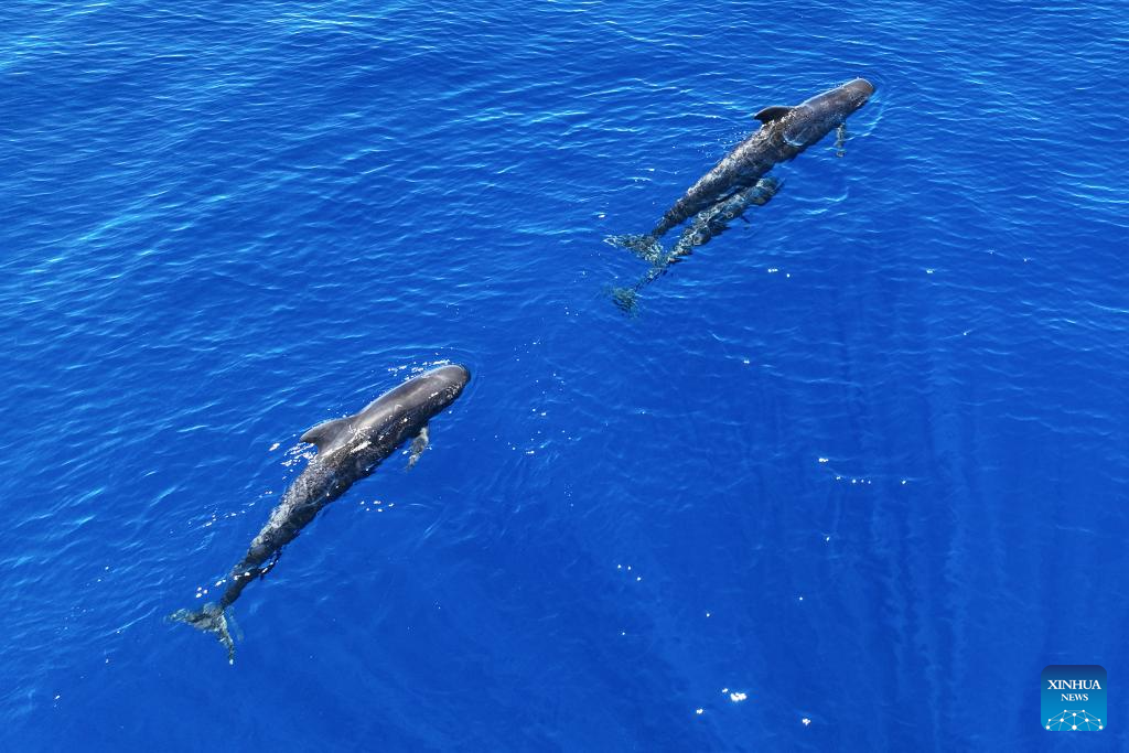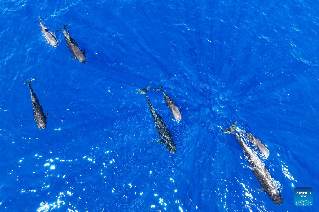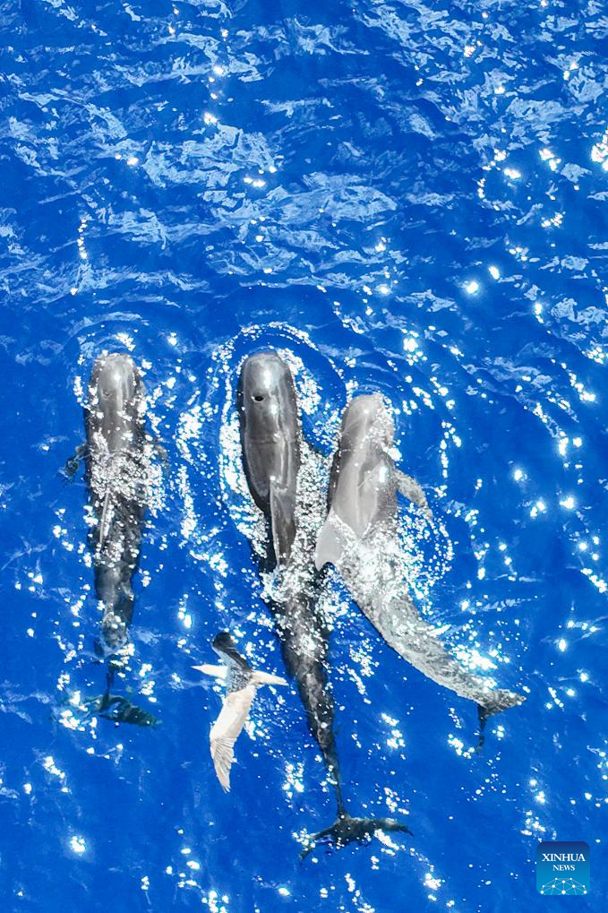 HAIKOU, 10 julio, 2024 (Xinhua) -- Imagen del 5 de julio de 2024 de ballenas piloto de aleta corta nadando en las aguas en el este de la isla de Hainan, en el sur de China. Una expedición de biodiversidad marina de 5 días llevada a cabo en Hainan concluyó el lunes. Los expertos afirman que la recientemente rescatada y liberada ballena piloto de aleta corta "Haitang" se encuentra en buenas condiciones. La ballena macho "Haitang" fue encontrada herida y varada en la bahía de Haitang de la ciudad de Sanya el 3 de enero, y fue enviada al Centro de Conservación Animal Haichang de Sanya para recibir tratamiento. Fue liberada nuevamente al mar el 26 de mayo después de una investigación y discusión exhaustivas por parte de los expertos. Basado en la información de un dispositivo de señalización colocado en su lomo, "Haitang" muestra buenas habilidades para vivir en libertad y adaptabilidad al entorno de las profundidades marinas. Dentro de su zona de nado, el equipo de expedición avistó una gran cantidad de ballenas piloto de aleta corta. De acuerdo con Li Songhai, científico jefe del equipo e investigador del Instituto de Ciencia e Ingeniería de Aguas Profundas (IDSSE, por sus siglas en inglés) de la Academia de Ciencias de China (CAS, por sus siglas en inglés), esto es un claro indicio de que "Haitang" ya ha encontrado su manada. "Esta es la primera ballena piloto de aleta corta rescatada con éxito en China", dijo Pu Bingmei, secretario general de la organización sin fines de lucro BlueRibbon Ocean Conservation Association (BROCA), quien señaló que el caso podría ofrecer una referencia importante para las labores de rescate marino. (Xinhua/Zhang Liyun)