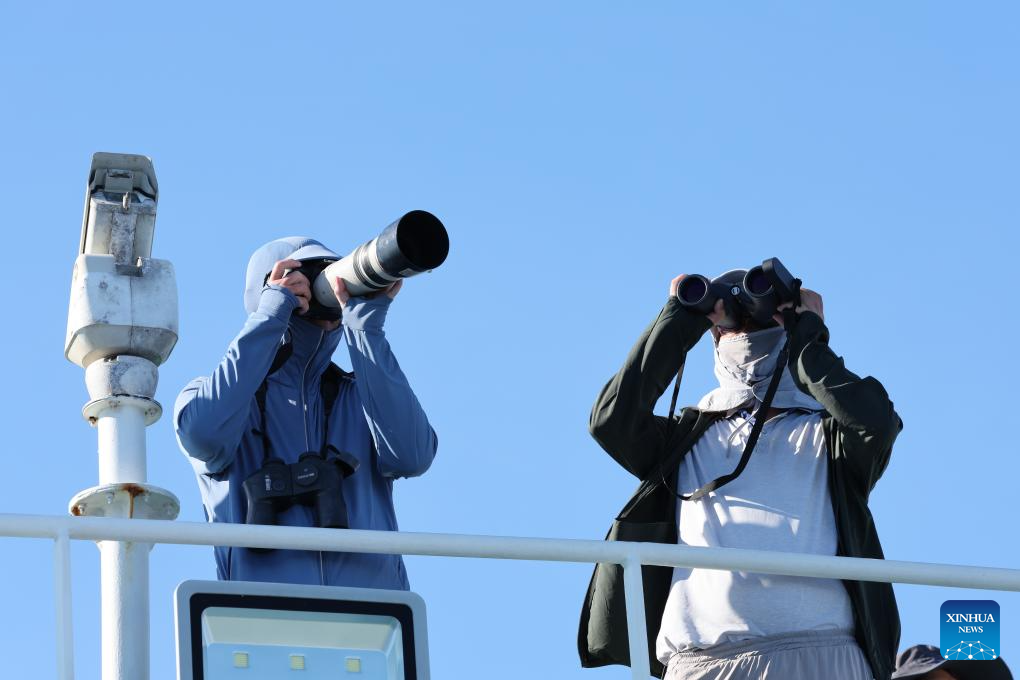 HAIKOU, 10 julio, 2024 (Xinhua) -- Imagen del 6 de julio de 2024 de miembros de un equipo de expedición de biodiversidad marina observando y tomando fotografías de ballenas piloto de aleta corta en cubierta en las aguas en el este de la isla de Hainan, en el sur de China. Una expedición de biodiversidad marina de 5 días llevada a cabo en Hainan concluyó el lunes. Los expertos afirman que la recientemente rescatada y liberada ballena piloto de aleta corta "Haitang" se encuentra en buenas condiciones. La ballena macho "Haitang" fue encontrada herida y varada en la bahía de Haitang de la ciudad de Sanya el 3 de enero, y fue enviada al Centro de Conservación Animal Haichang de Sanya para recibir tratamiento. Fue liberada nuevamente al mar el 26 de mayo después de una investigación y discusión exhaustivas por parte de los expertos. Basado en la información de un dispositivo de señalización colocado en su lomo, "Haitang" muestra buenas habilidades para vivir en libertad y adaptabilidad al entorno de las profundidades marinas. Dentro de su zona de nado, el equipo de expedición avistó una gran cantidad de ballenas piloto de aleta corta. De acuerdo con Li Songhai, científico jefe del equipo e investigador del Instituto de Ciencia e Ingeniería de Aguas Profundas (IDSSE, por sus siglas en inglés) de la Academia de Ciencias de China (CAS, por sus siglas en inglés), esto es un claro indicio de que "Haitang" ya ha encontrado su manada. "Esta es la primera ballena piloto de aleta corta rescatada con éxito en China", dijo Pu Bingmei, secretario general de la organización sin fines de lucro BlueRibbon Ocean Conservation Association (BROCA), quien señaló que el caso podría ofrecer una referencia importante para las labores de rescate marino. (Xinhua/Zhang Liyun)