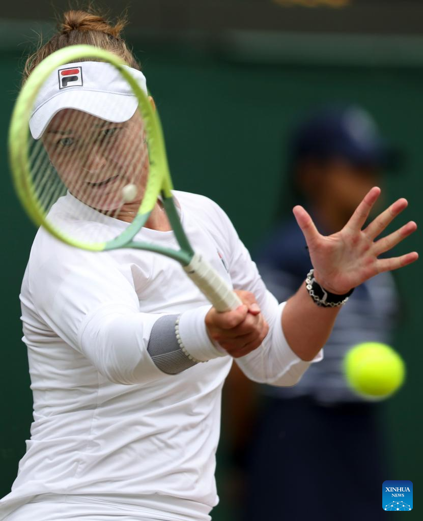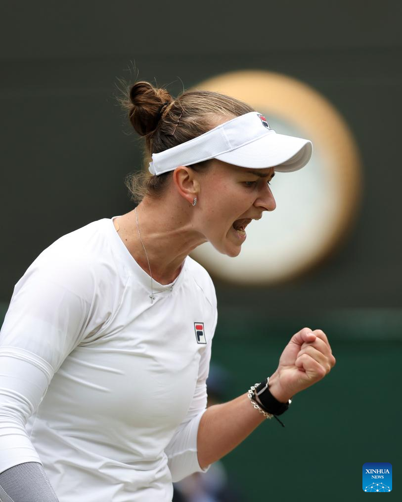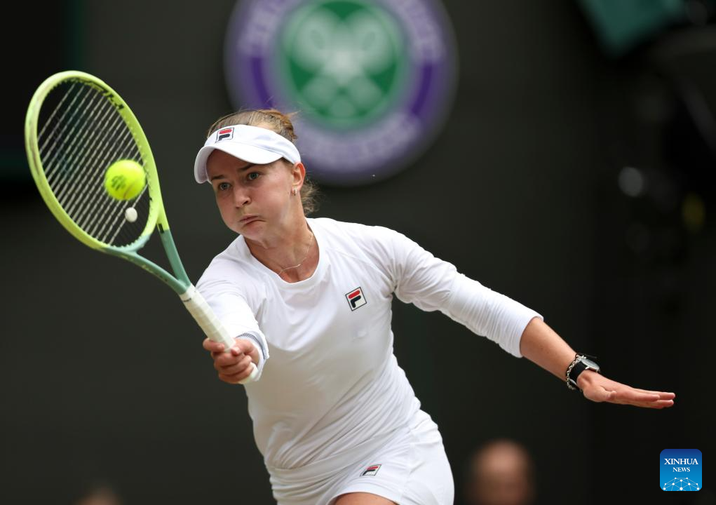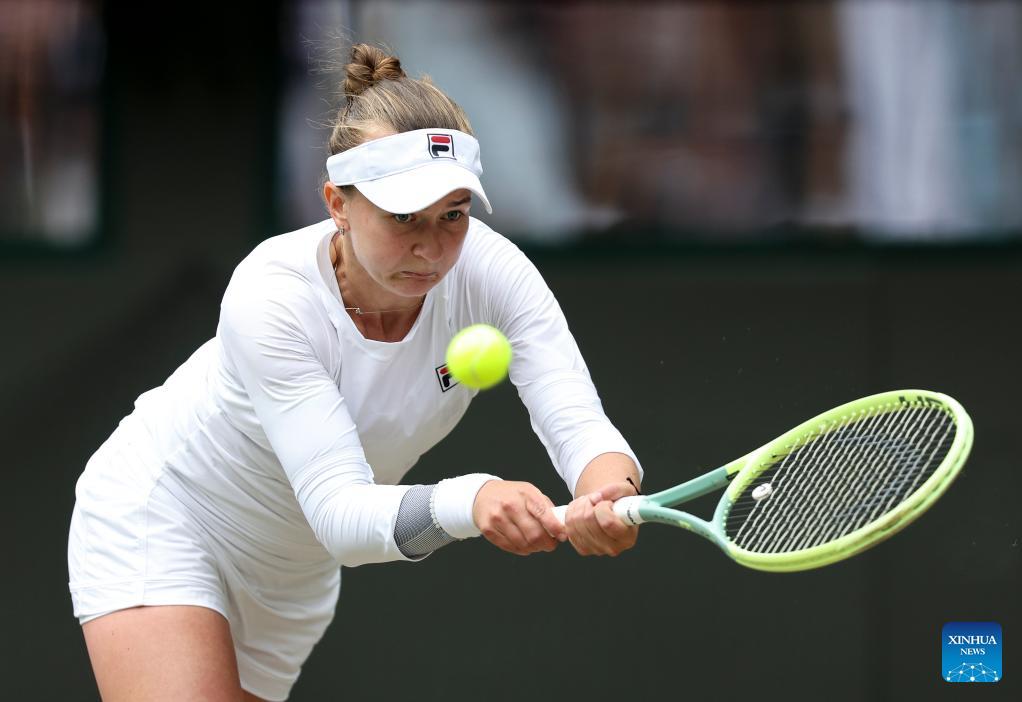 LONDRES, 10 julio, 2024 (Xinhua) -- Barbora Krejcikova, de República Checa, devuelve la pelota durante el partido de cuartos de final de individuales femeninos entre Jelena Ostapenko, de Letonia, y Barbora Krejcikova, de República Checa, en el Campeonato de Tenis de Wimbledon, en Londres, Reino Unido, el 10 de julio de 2024. (Xinhua/Han Yan)
