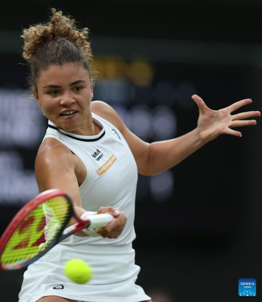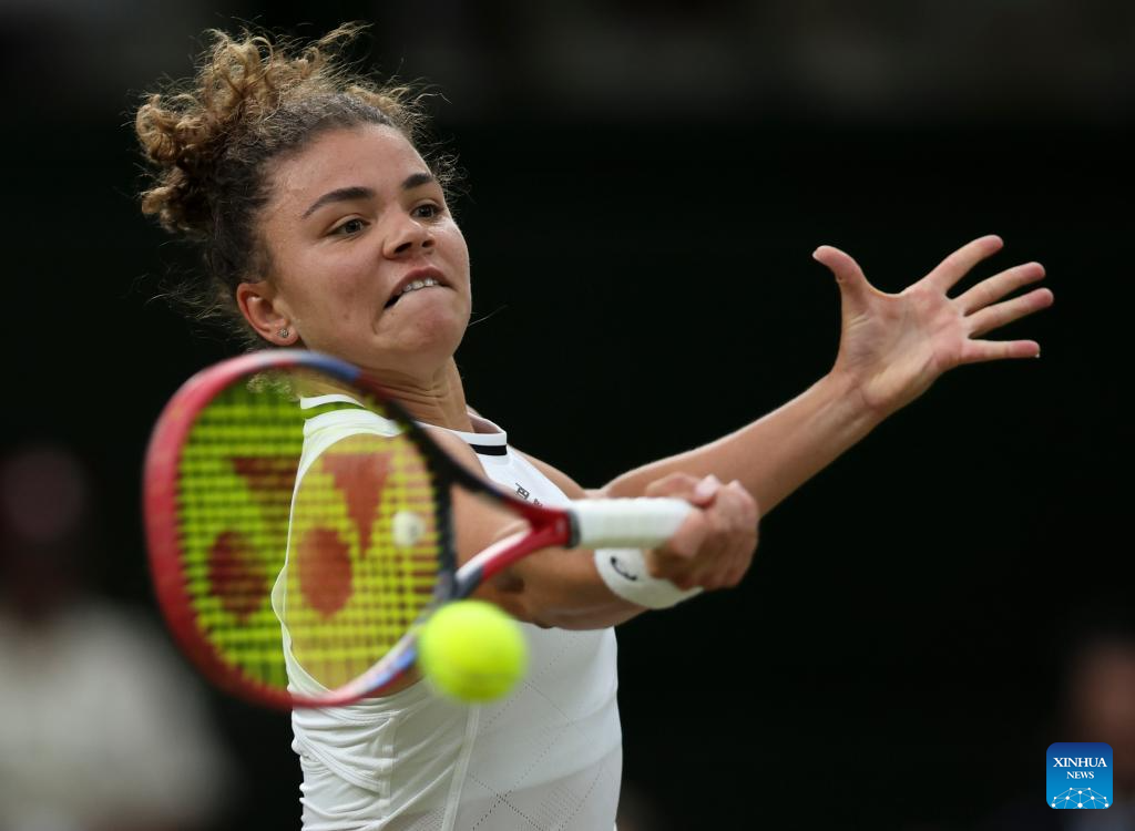 LONDRES, 10 julio, 2024 (Xinhua) -- Imagen del 9 de julio de 2024 de Jasmine Paolini compitiendo durante el partido de cuartos de final de individuales femeninos entre Emma Navarro, de Estados Unidos, y Jasmine Paolini, de Italia, en el Campeonato de Tenis de Wimbledon, en Londres, Reino Unido. (Xinhua/Han Yan)