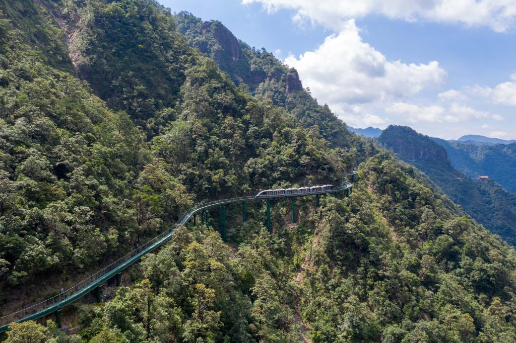 DISTRITO DE ZIXI, 11 julio, 2024 (Xinhua) -- Un tren de unidades eléctricas múltiples (EMU, por sus siglas en inglés) se mueve en el Area Escénica de la Montaña Dajue, en la provincia de Jiangxi, en el este de China, el 11 de julio de 2024. Un lote de 30 trenes de EMU, parte de lo que se denomina "trenes turísticos monorraíl elevados y sistema de vías de zona montañosa", fue entregado el jueves al Area Escénica de la Montaña Dajue en el distrito de Zixi, en la provincia de Jiangxi, en el este de China. Con más de un tercio de la ruta turística de 11,8 kilómetros discurriendo a lo largo de un acantilado, los trenes "cuelgan" a los visitantes en el aire a una altura de entre 850 y 1.150 metros. Es por mucho, la ruta de tren sobre acantilados más larga conocida de China. (Xinhua/Guo Jiewen)