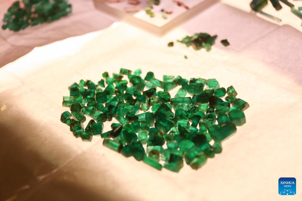 PANJSHIR, 11 julio, 2024 (Xinhua) -- Imagen del 10 de julio de 2024 de esmeraldas vistas durante una feria de esmeraldas y sus productos, llevada a cabo en la provincia de Panjshir, Afganistán. Una feria de esmeraldas y sus productos fue inaugurada el miércoles en la provincia de Panjshir, Afganistán, con el objetivo de promover la inversión en el sector minero, dijo el portavoz del Ministerio de Minas y Petróleo, Hamayon Afghan. (Xinhua/Saifurahman Safi)
